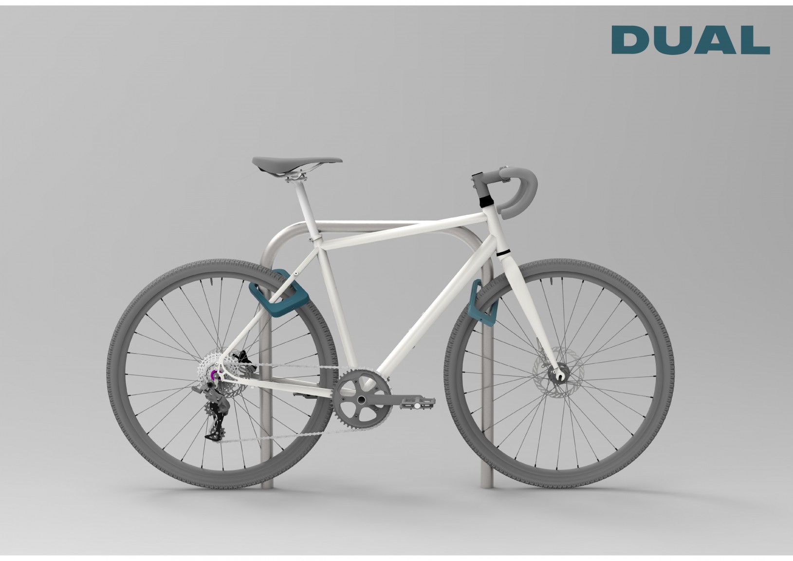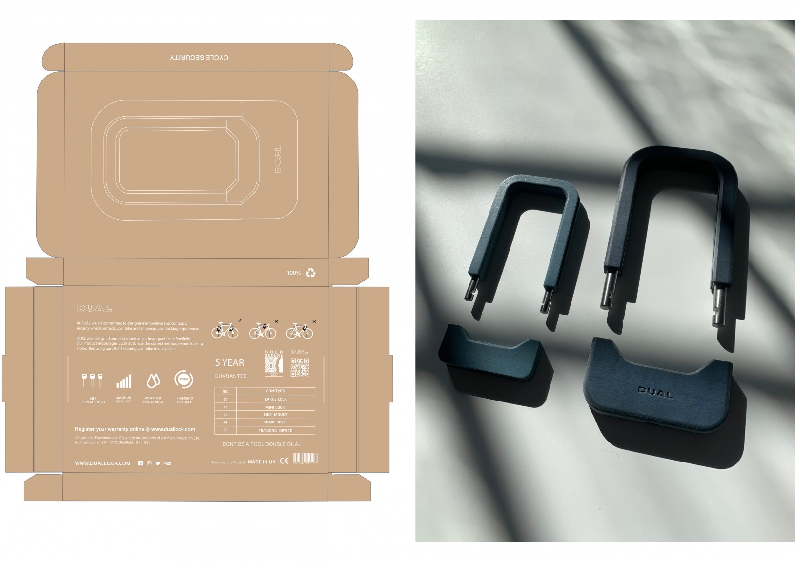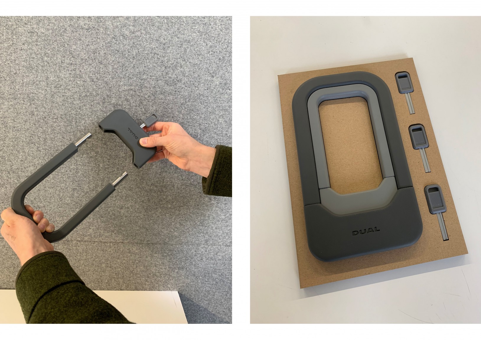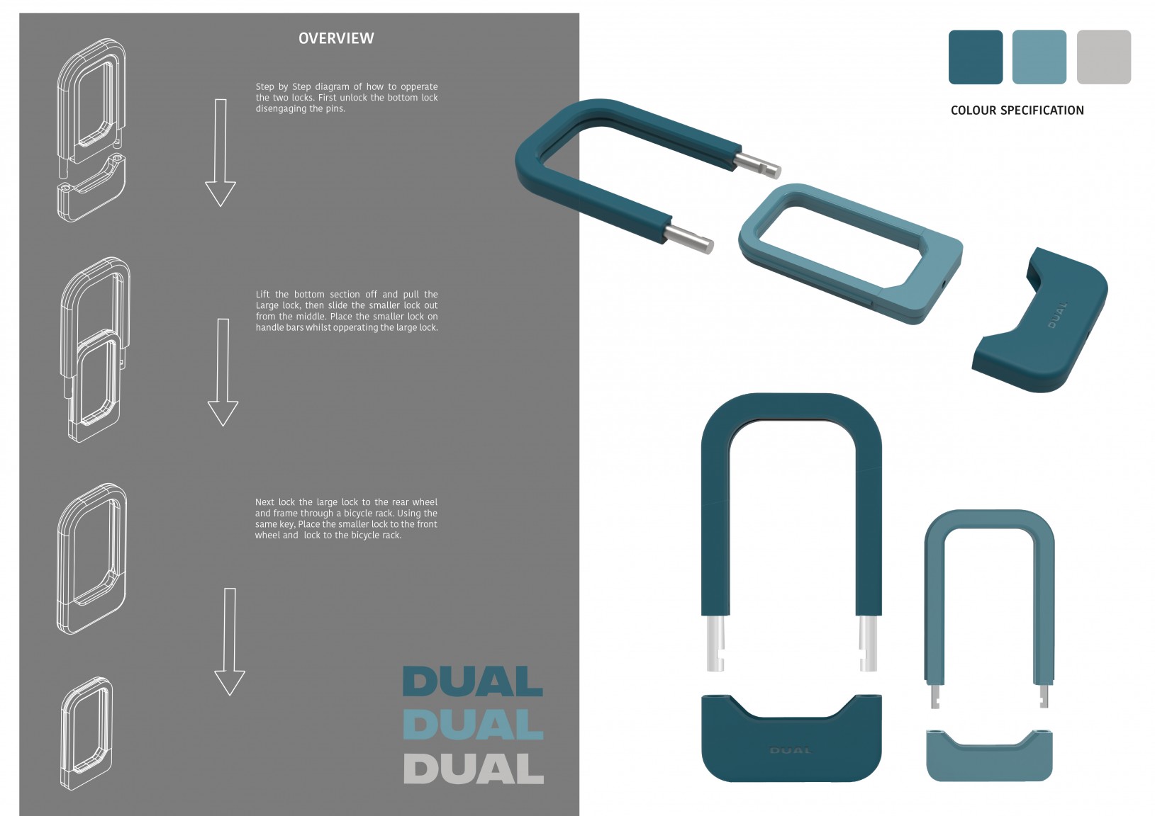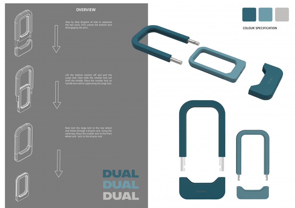 Over four years at university five of Finn Mcgloin Ashman‘s close friends and himself have had a bicycle stolen in the city. Thus sparked the idea to re-design the outdated and inconvenient bicycle lock. DUAL forces individuals to lock their bicycle using correct methods due to its compact storage solution eliminating the need for carrying two separate types of security.