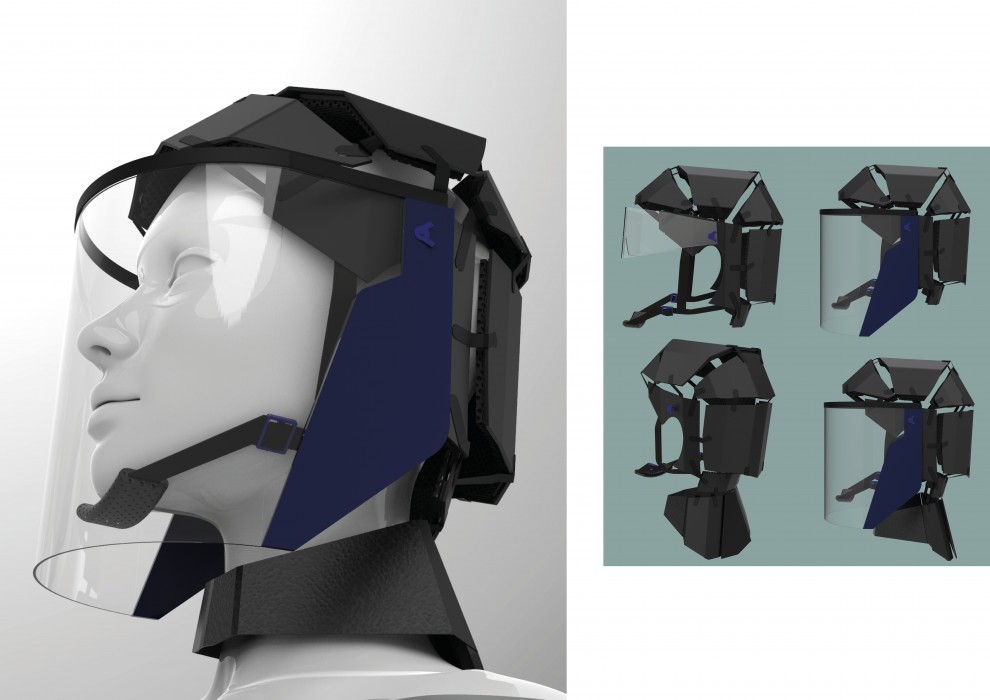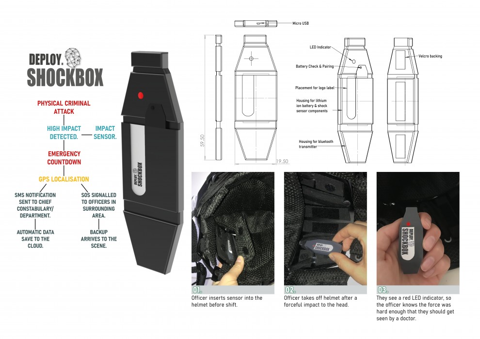 Deploy is a protective helmet which prevents officers from sustaining severe cranial injuries during violent encounters with criminal activities. The helmet is composed of an adaptive elastic structure which provides a ‘one size fits all’ approach, meaning that the head equipment can be shared equally amongst all genders and cranial sizes amongst the force. The materiality composition of the helmet can be dissected into two sections: The impact resistant outer shell, which composes of lightweight ABS and shock absorbing neoprene foam, and the detachable inner fabric padding, which utilises an internal layer of corrugated expanded polypropylene foam, for stab-proof properties, and a polyester mesh for increased cranium ventilation. When not in use, the product sits discreetly compact on the officer’s belt, but quickly transforms into a dynamic, bold aesthetic to assert dominance in dangerous settings. Unlike policing riot helmets, which are expensive and not accessible to use by all officers, Deploy offers an economically viable and practical protective solution to officers of all ranks across the force.