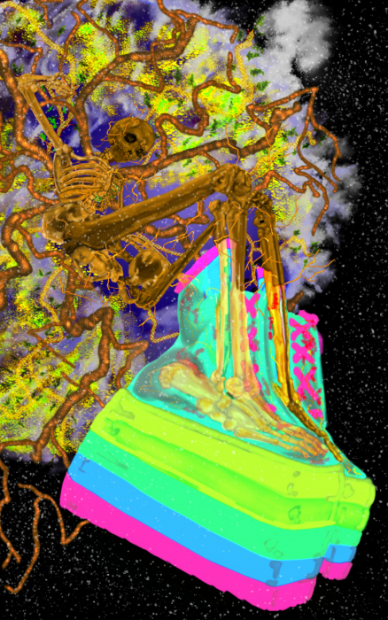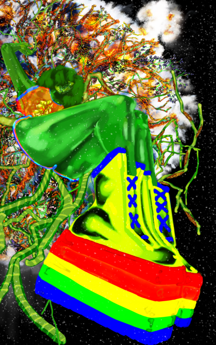 Reimagining nature, Ethoriera depicts an overwatching guardian. Projecting a larger than life ‘protector’, in various forms, shapes, and colours to create a psychedelic effect.