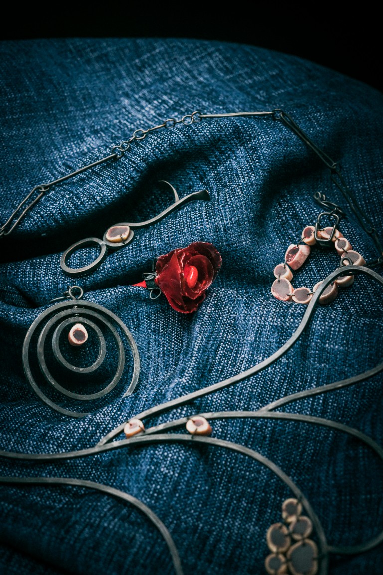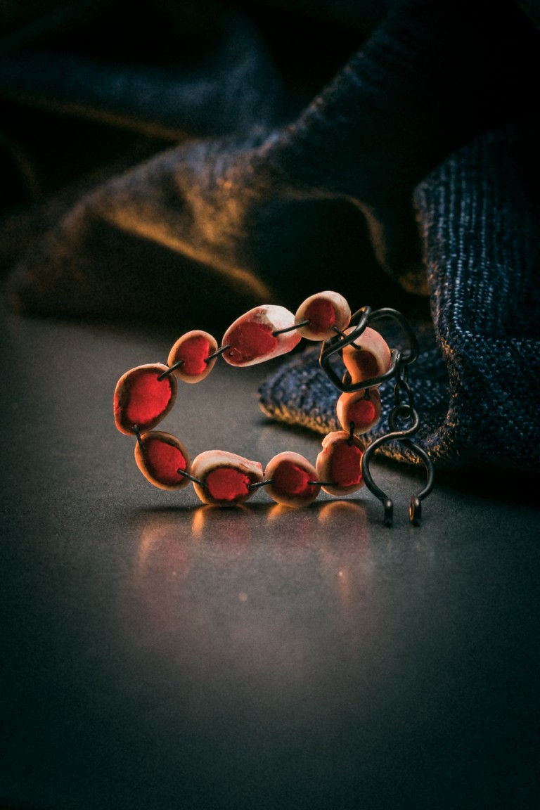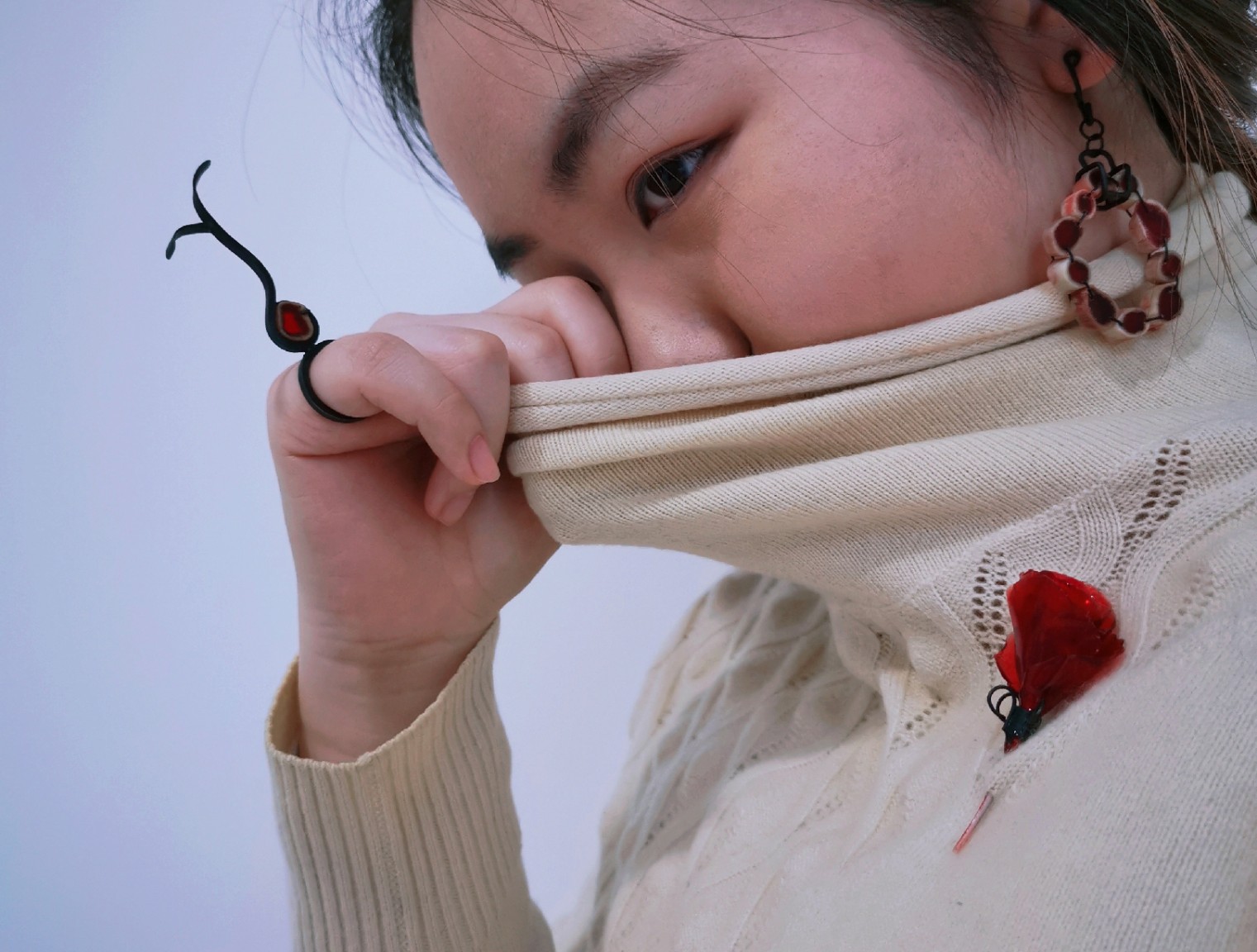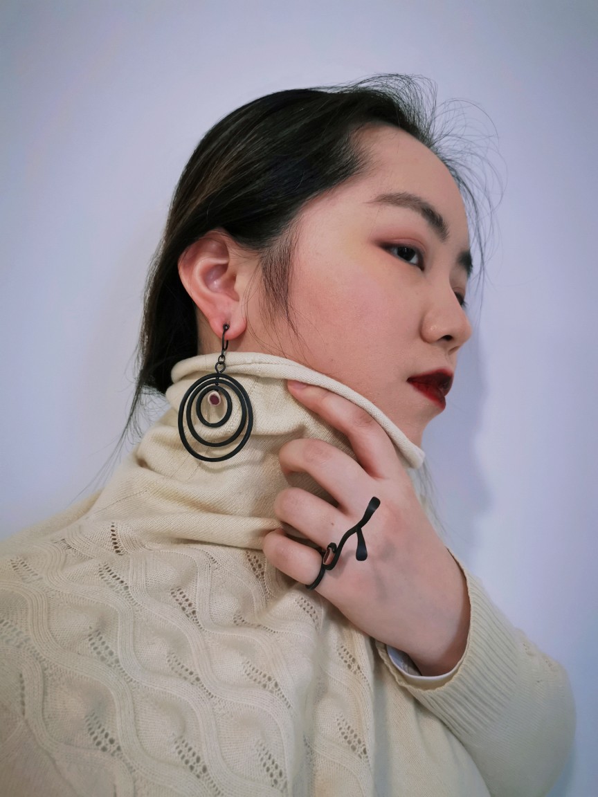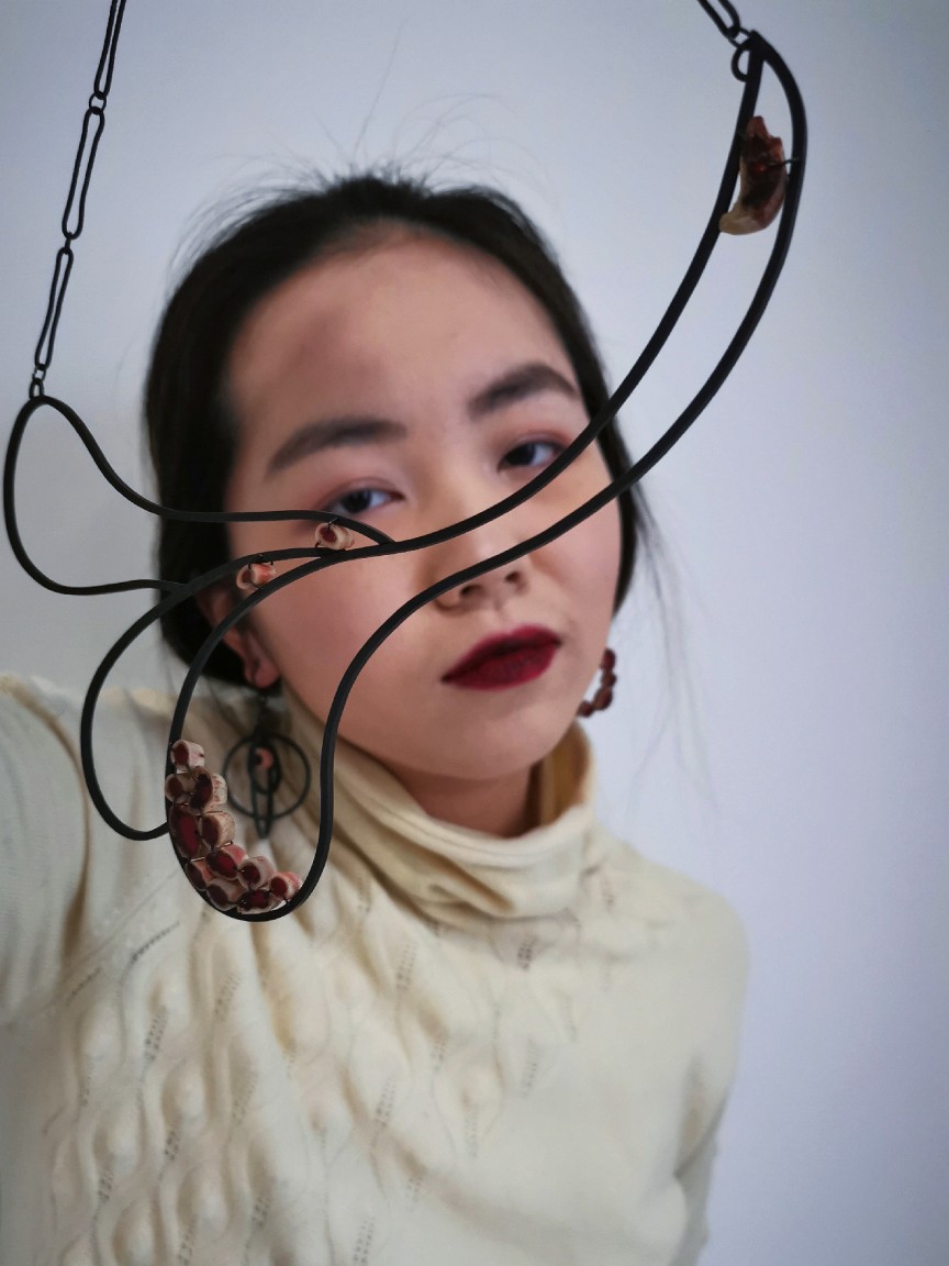 For this work, Ye made a preliminary study of Carl Jung’s ‘shadow self’ theory, observing and categorising negative human behaviours and their depictions in art. After studying various villainous images, Ye tested different and uncomfortable materials that could be used to make her jewellery. In the end, the material Ye chose was bird bones, in which the red resin pools to represent blood. Ye’s aim is to help people think about wider issues when they see the jewellery. Everyone has a dark side and only when we control and accept this dark side can we achieve a healthy mental state. Our dark thoughts can then become another kind of power to help us.