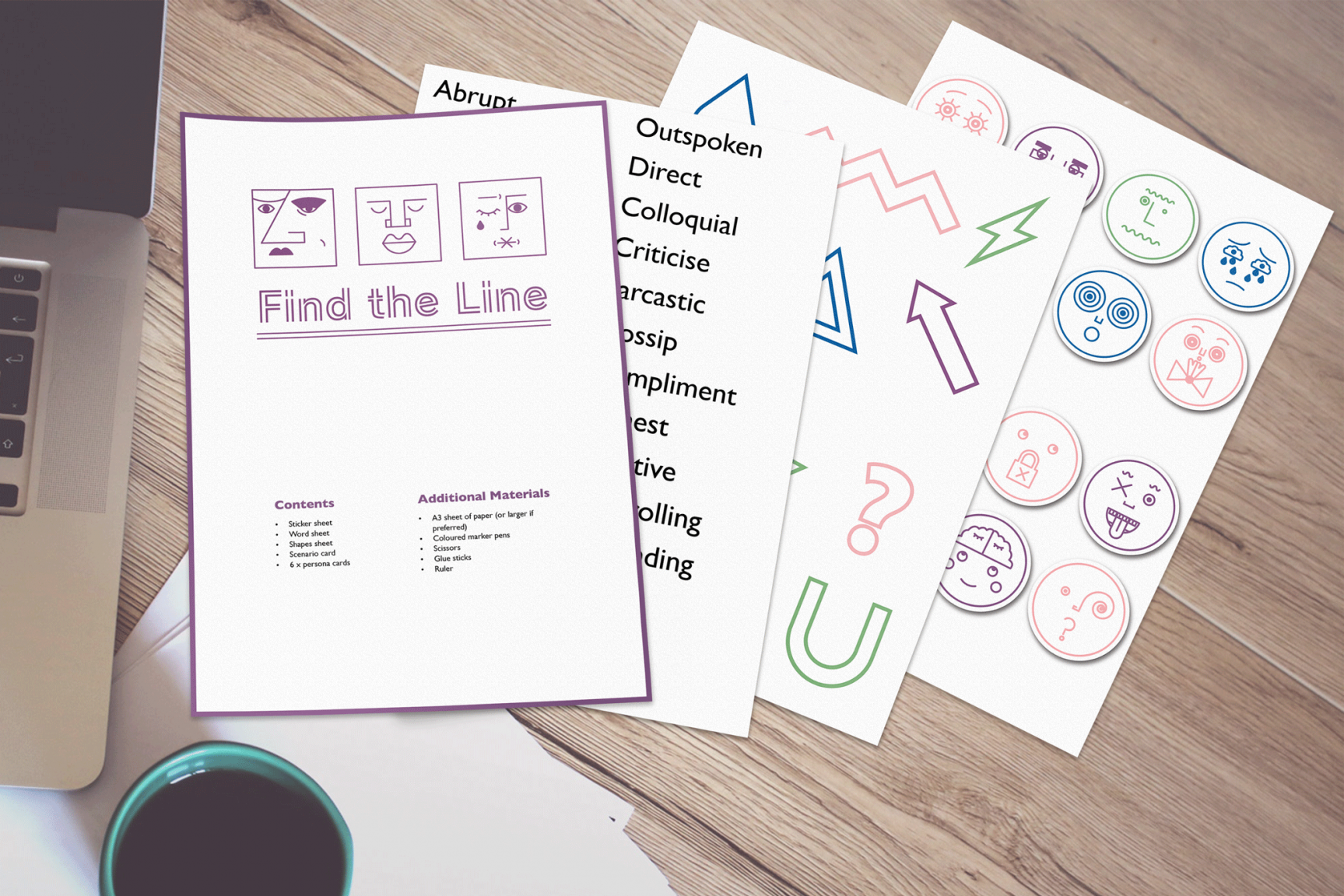Find the Line is an anti-bullying toolkit designed and created by Cherise Wigginton, with illustrations by Gabrielle Scott. The toolkit contains tactile tools for two tasks which form an educational workshop for the workplace. It aims to bring colleagues together and start a discussion about behaviour in a professional environment. The goal is to help both employers and employees identify the line between bullying and acceptable interactions.