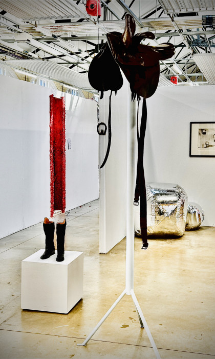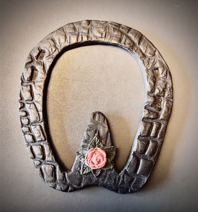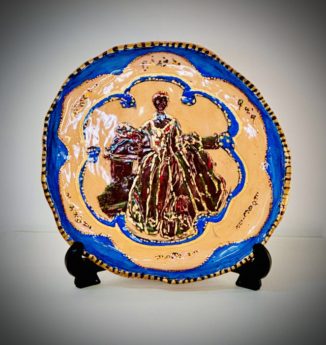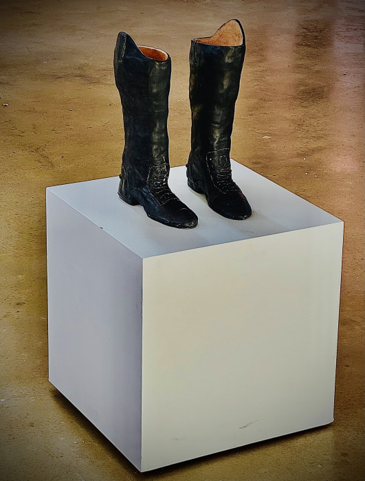 Alongside the audio piece, Burns presents a series of ceramic works: a hand-built pair of worn-out riding boots based on her own; a single earthenware horseshoe representing ‘Skittles’ – bold, stylish, and unforgettable; and a buff stoneware plate titled ‘A Dark Horse’, reflecting the influence of Madame de Pompadour – a woman whose impact on politics, patronage and equestrianism remains both overlooked and profound.