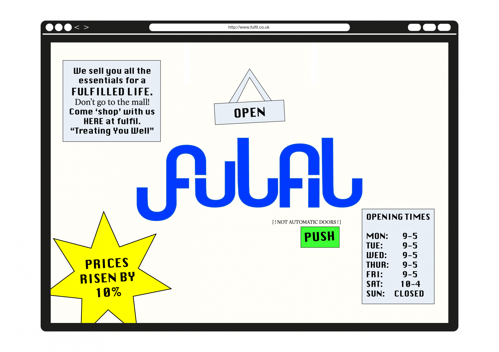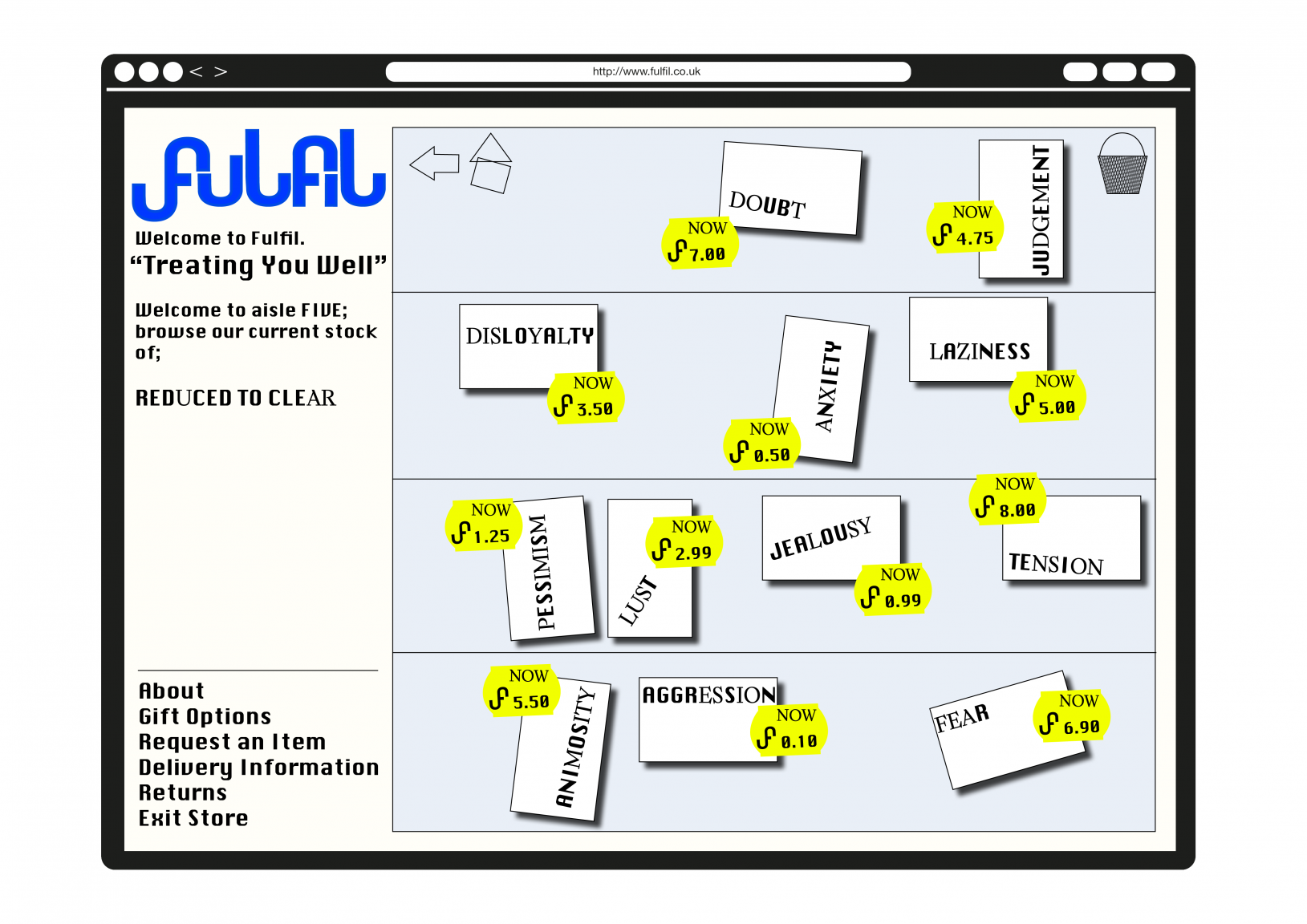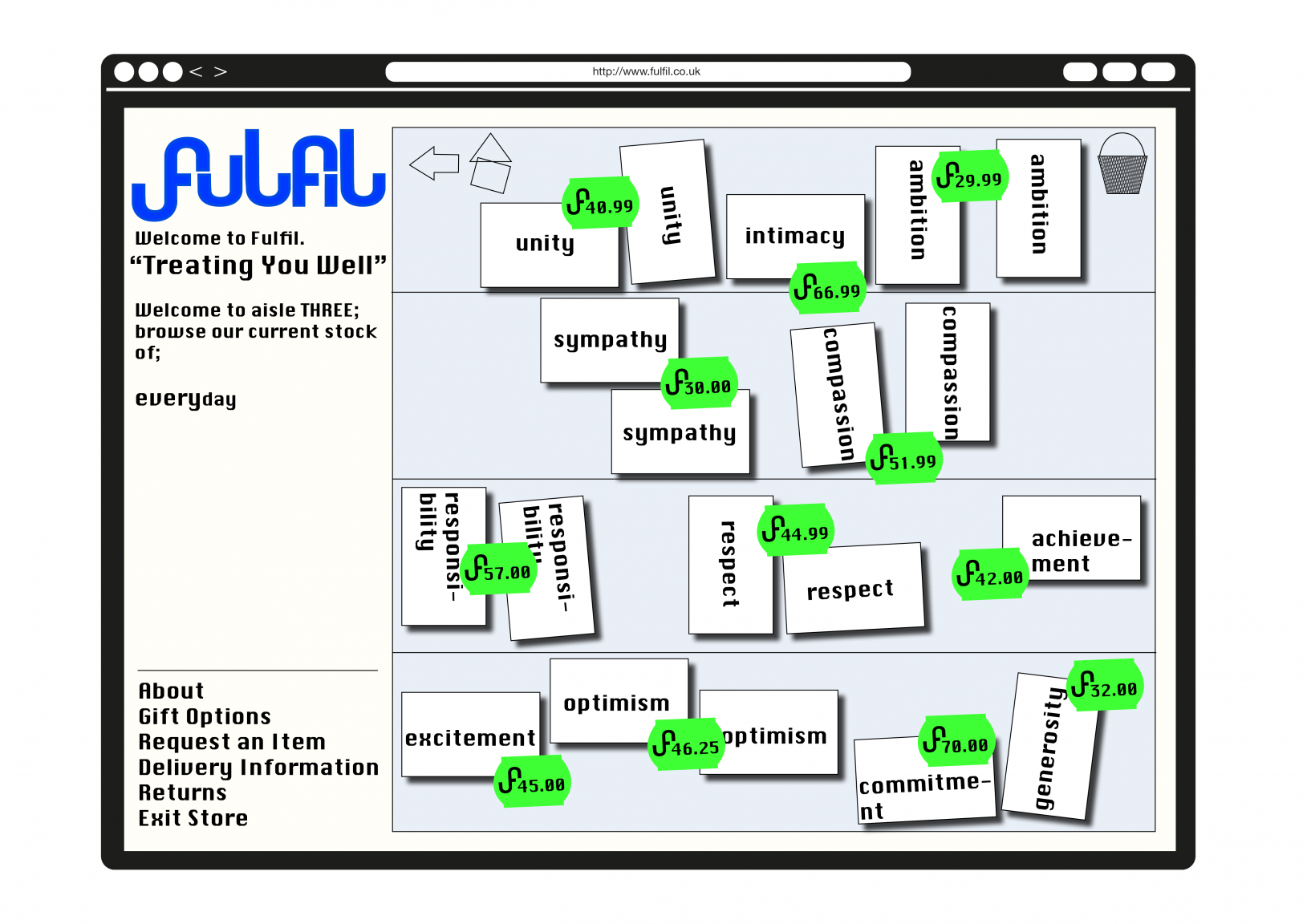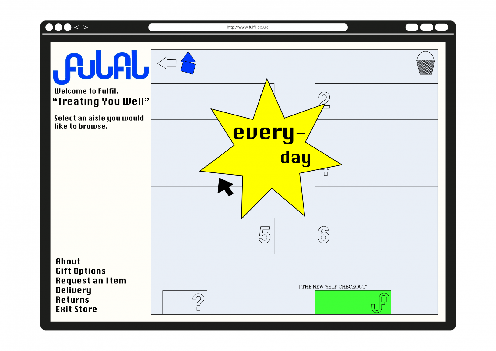 Emily Barker’s web project Fulfil is an exploration into the effects that instant access to products has on human psychology and our ecology.