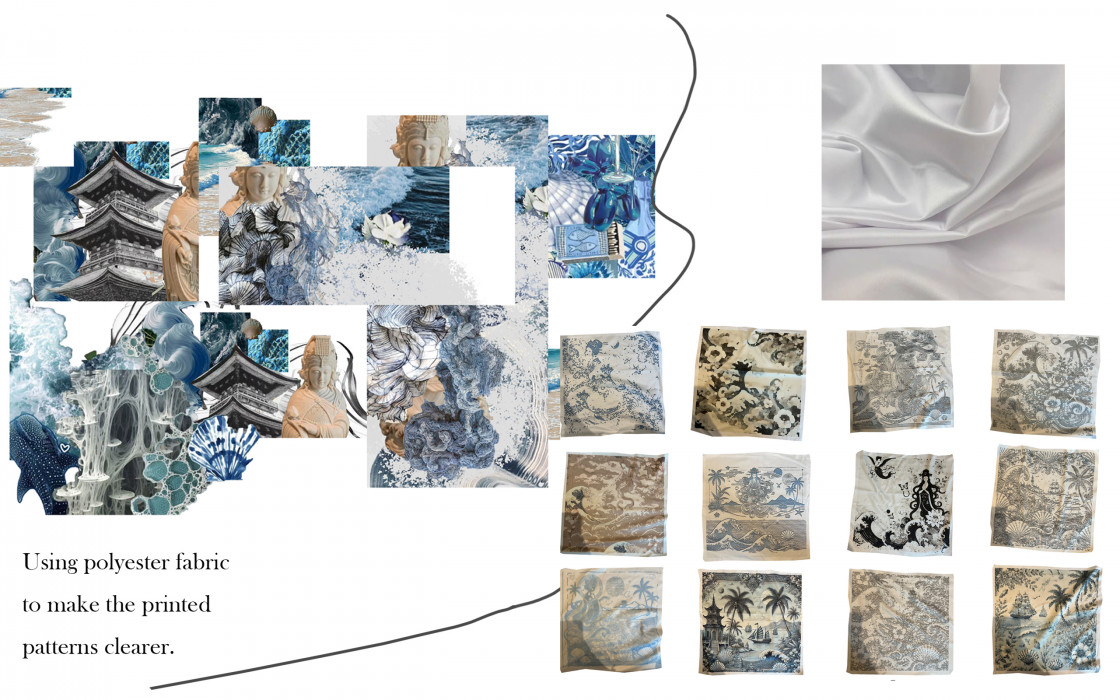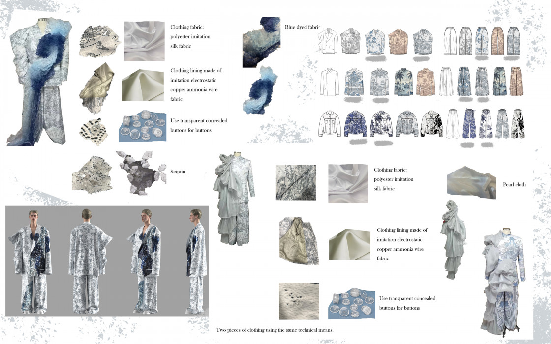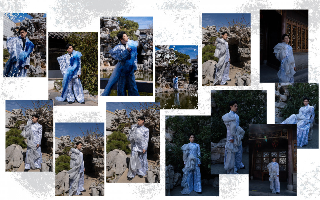You’s collection integrates traditional cultural values into modern silhouettes, with oceanic and island elements expressed through varying shades of blue. They referenced artistic representations of Mazu’s clothing and sculpture and conducted field studies to stay grounded in real cultural context. To reflect sustainability and craftsmanship, they used Chinese indigo dyeing with natural plant-based dyes.