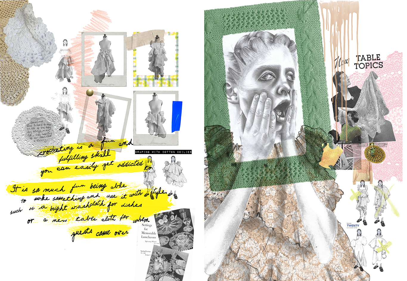 Creighton took inspiration from old crochet/dinner party books and collected a variety of vintage doilies for these pages.