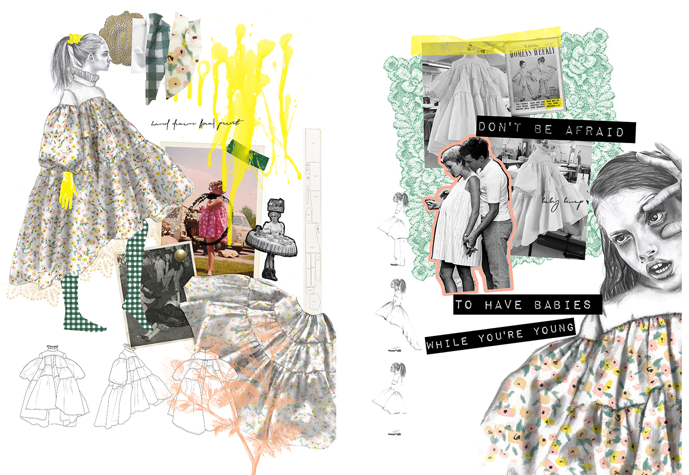 The silhouette was derived from a woman’s changing shape through pregnancy and vintage clothing research. The print was hand drawn and printed onto cotton poplin.