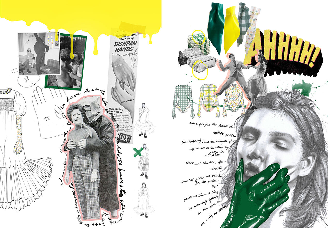 This page on gloves focuses on the idea of being held, being owned and being captured, both physically and mentally. Women enslaved to their homes and their families. The words ‘to have and to hold’ are repeated. The different colours and fabrics for rubber gloves are also explored to represent domestic labour.