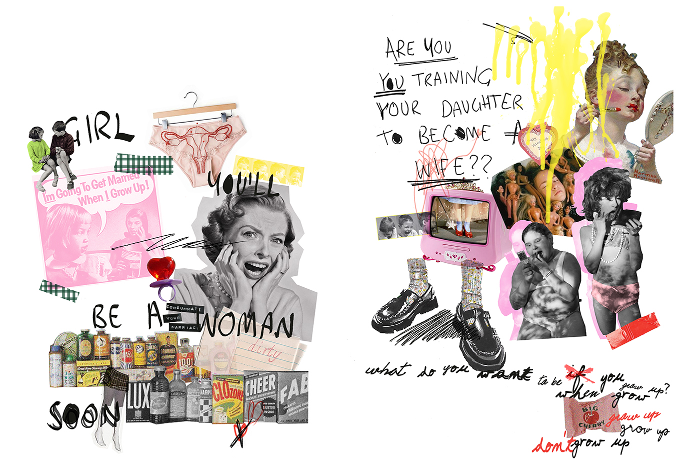Growing up mood boards about childhood raising the perfect housewife. This looks at the innocence and naivety of children, and the trap for daughters - the desire to grow up.