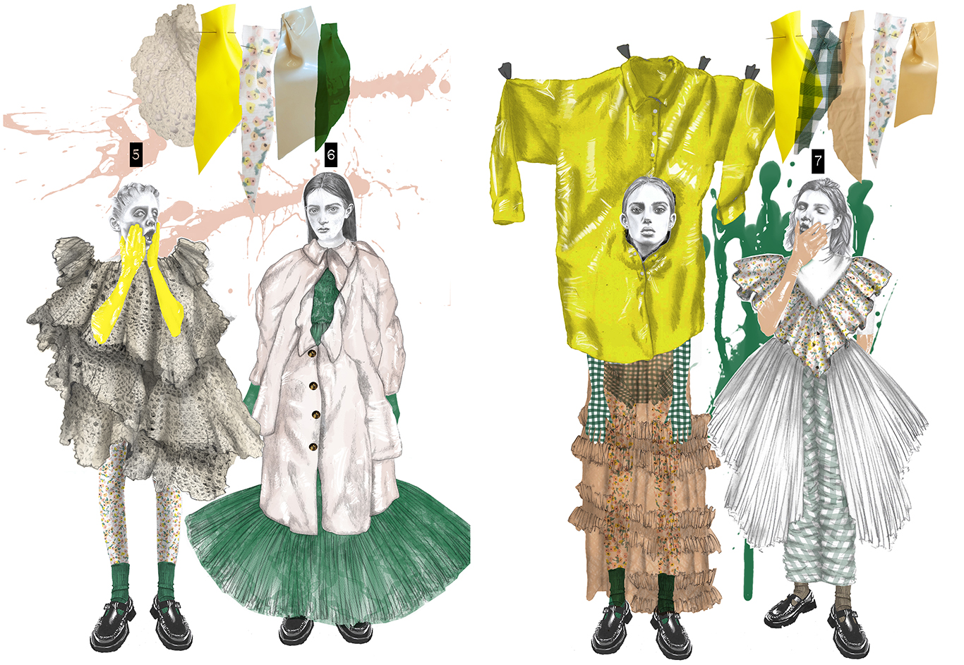 The first four looks of the line up, using fabrics such as hand printed cotton poplin, broderie anglaise, thick latex and crochet cotton dress.