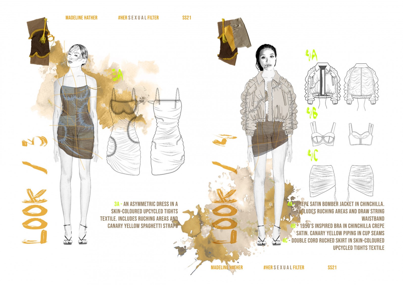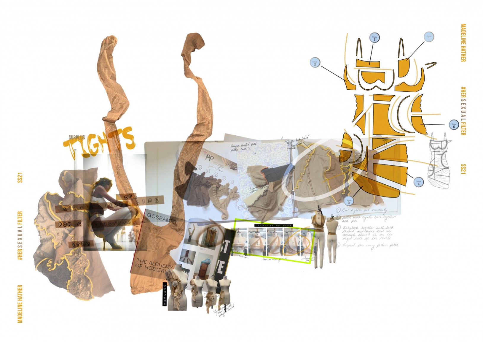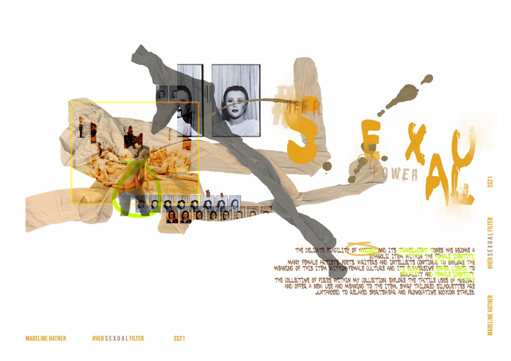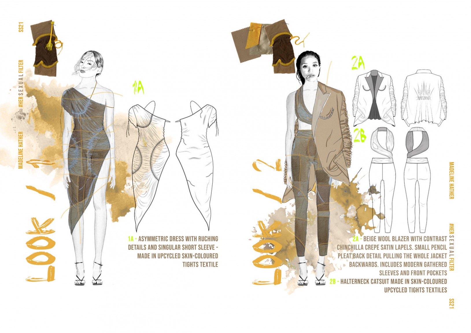 The delicate fragility of hosiery and its translucent tones has become a symbolic item within the female identity. Many female artist, poets and writers continue to explore the meaning of this item within female culture and its subversive power linked to sexuality and female identity. The collective of pieces within Madeline Hather’s collection #HERSEXUALPOWER, explore the tactile uses of hosiery and offer a new use and meaning to the item. Sharp tailored silhouettes are juxtaposed with relaxed sportwear, and provocative bodycon staples and the symbolism of hoisiery to female identity is explored. This is a provocative approach to womenswear and creating a new meaning to undergarments, expressing the beauty of it as outerwear and representing the strength of femininity through a contemporary empowered wardrobe.