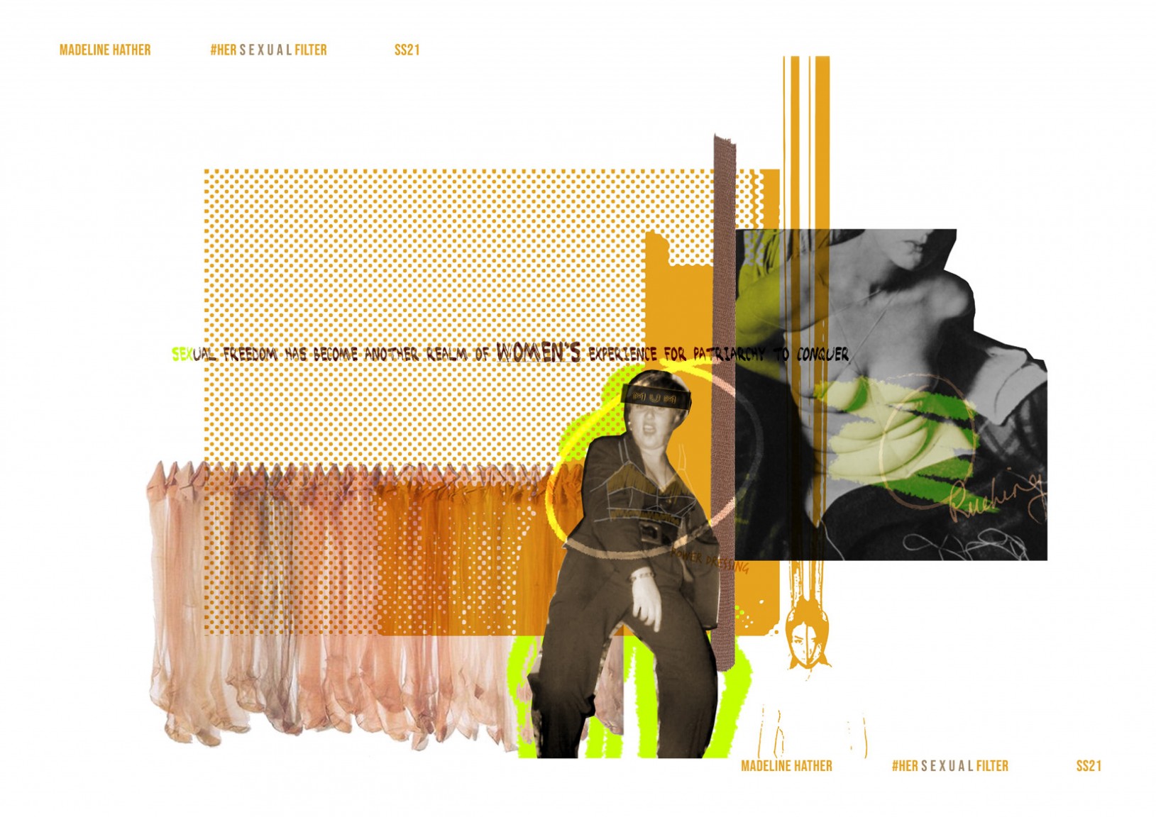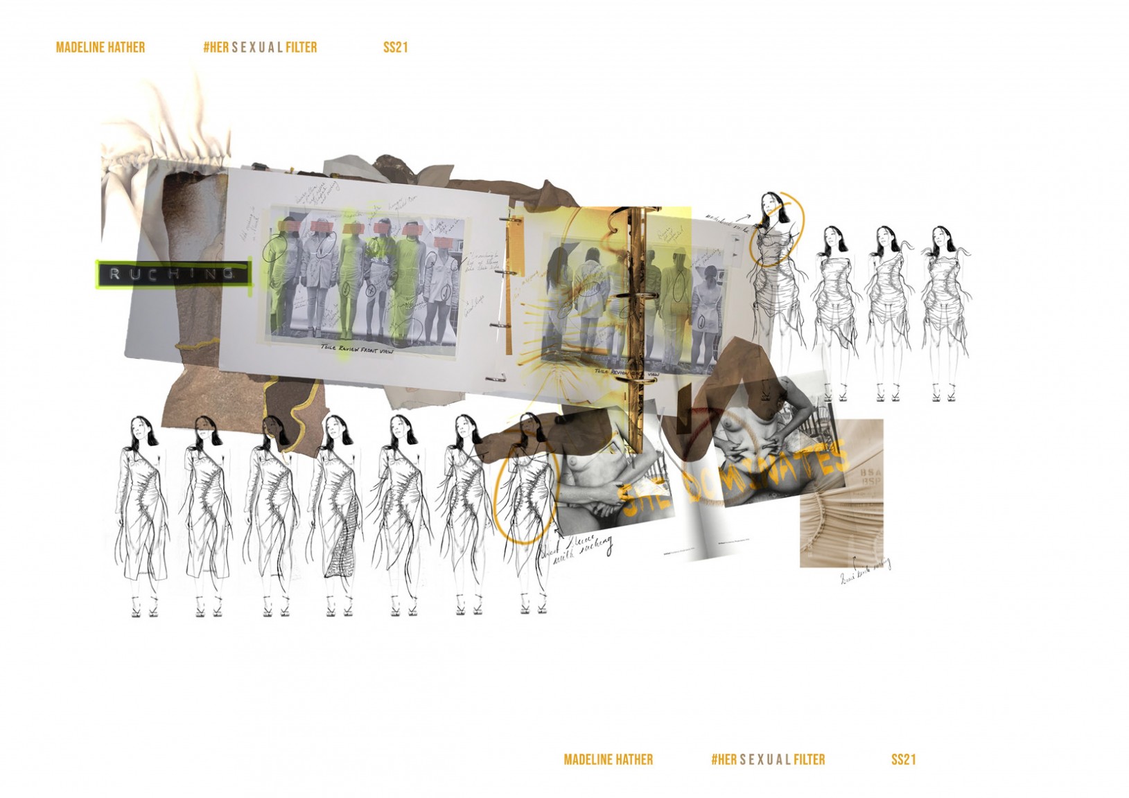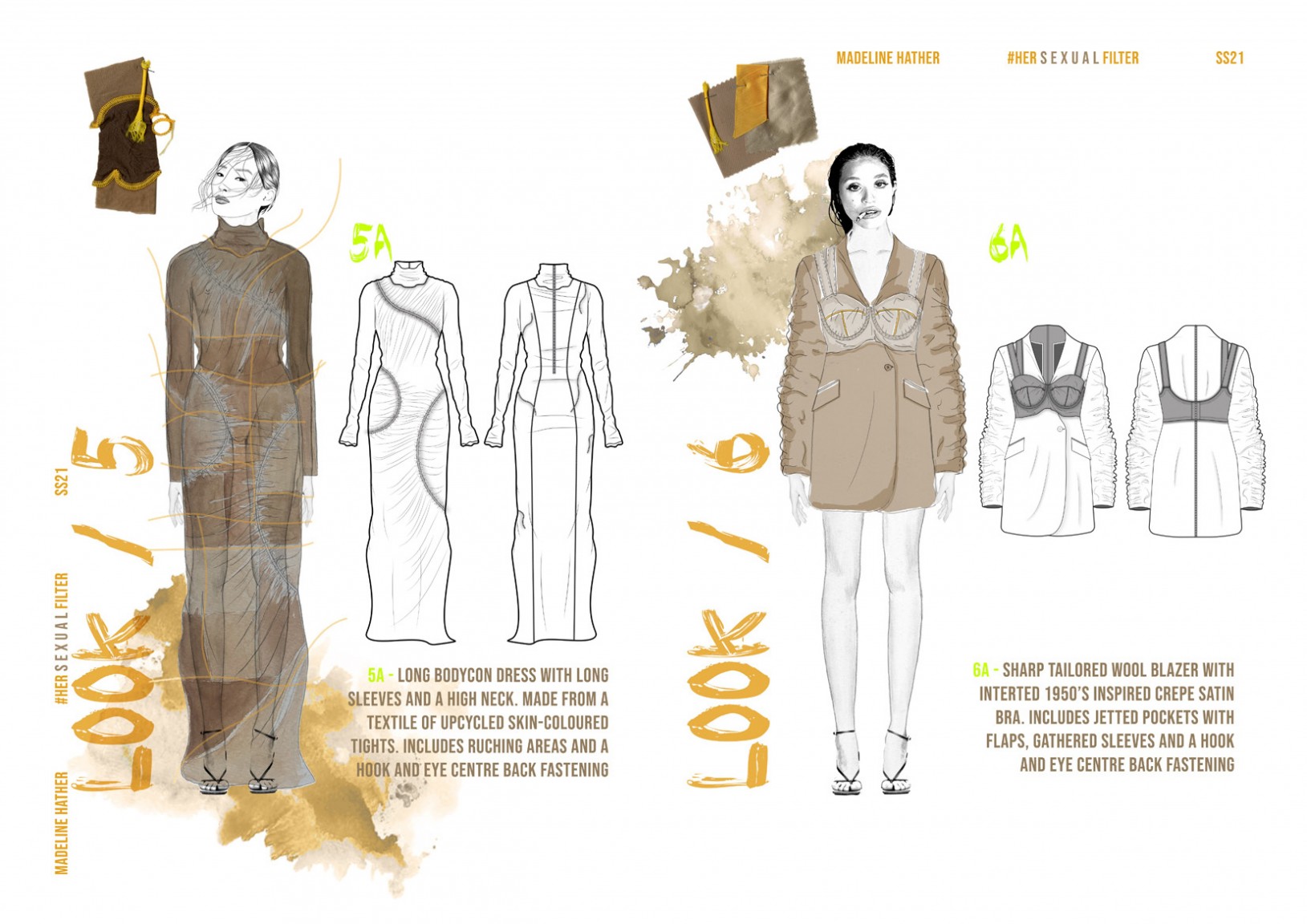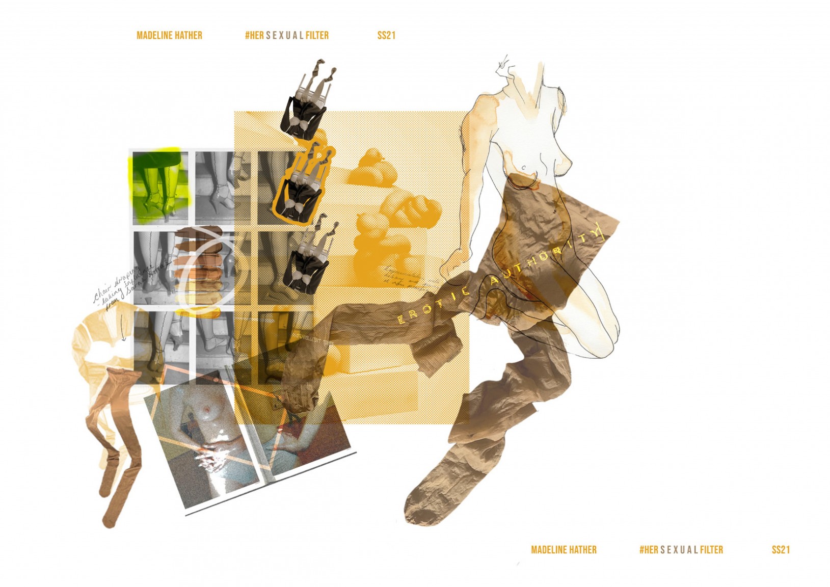The delicate fragility of hosiery and its translucent tones has become a symbolic item within the female identity. Many female artist, poets and writers continue to explore the meaning of this item within female culture and its subversive power linked to sexuality and female identity. The collective of pieces within Madeline Hather’s collection #HERSEXUALPOWER, explore the tactile uses of hosiery and offer a new use and meaning to the item. Sharp tailored silhouettes are juxtaposed with relaxed sportwear, and provocative bodycon staples and the symbolism of hoisiery to female identity is explored. This is a provocative approach to womenswear and creating a new meaning to undergarments, expressing the beauty of it as outerwear and representing the strength of femininity through a contemporary empowered wardrobe.