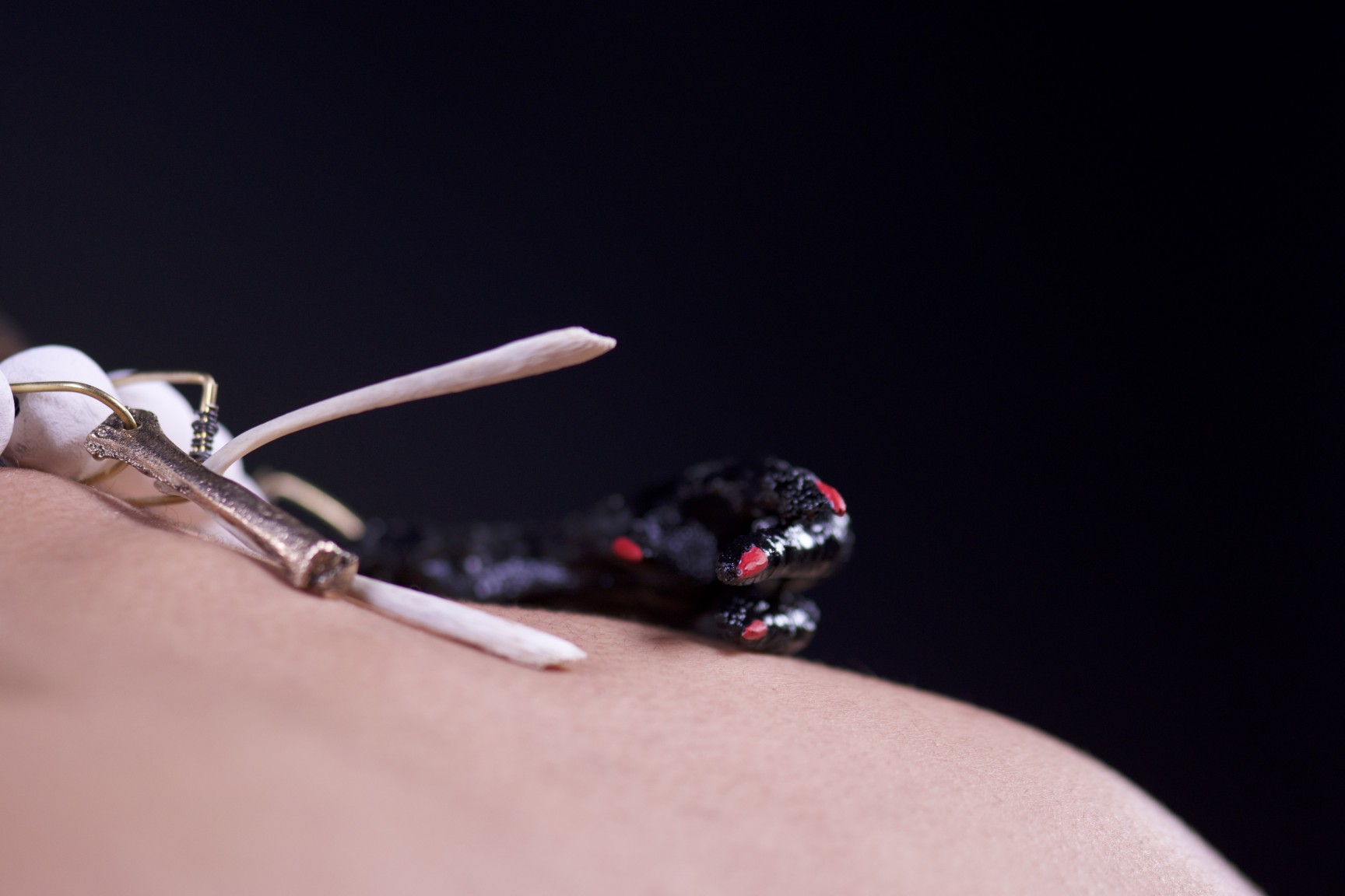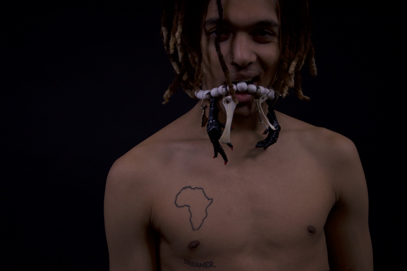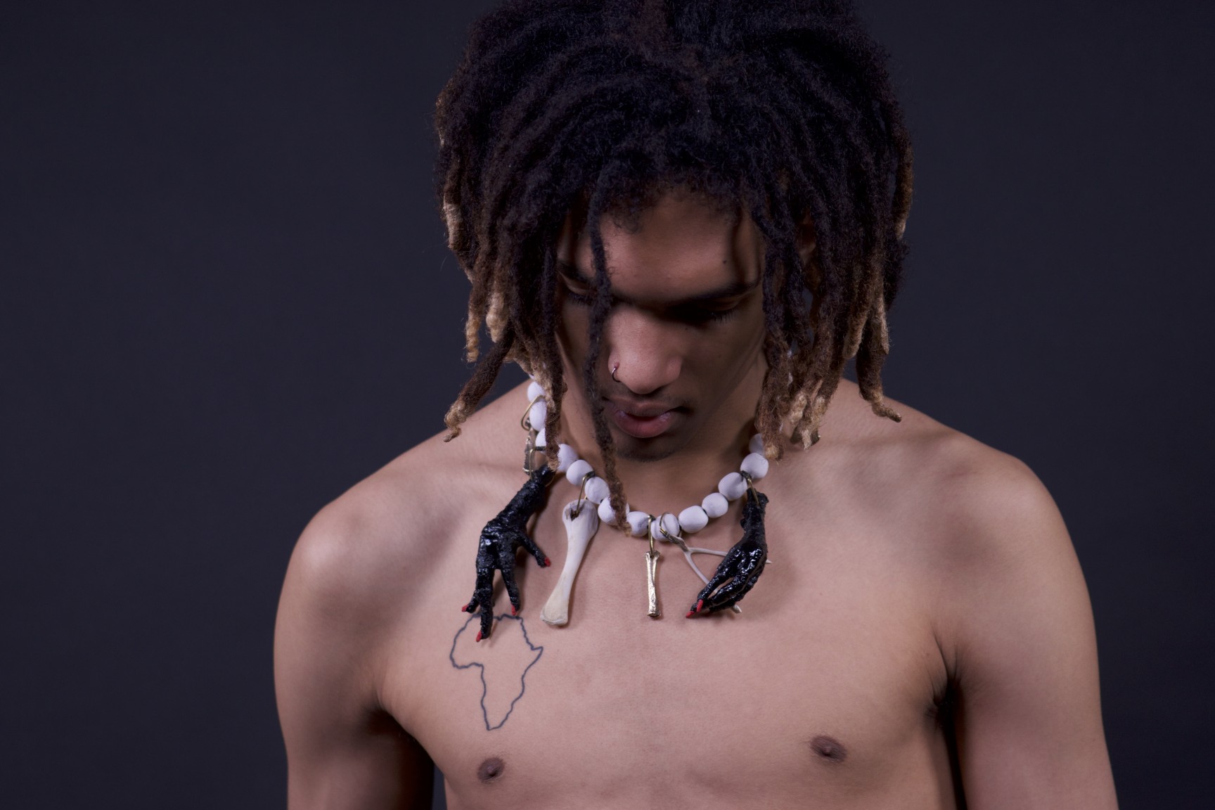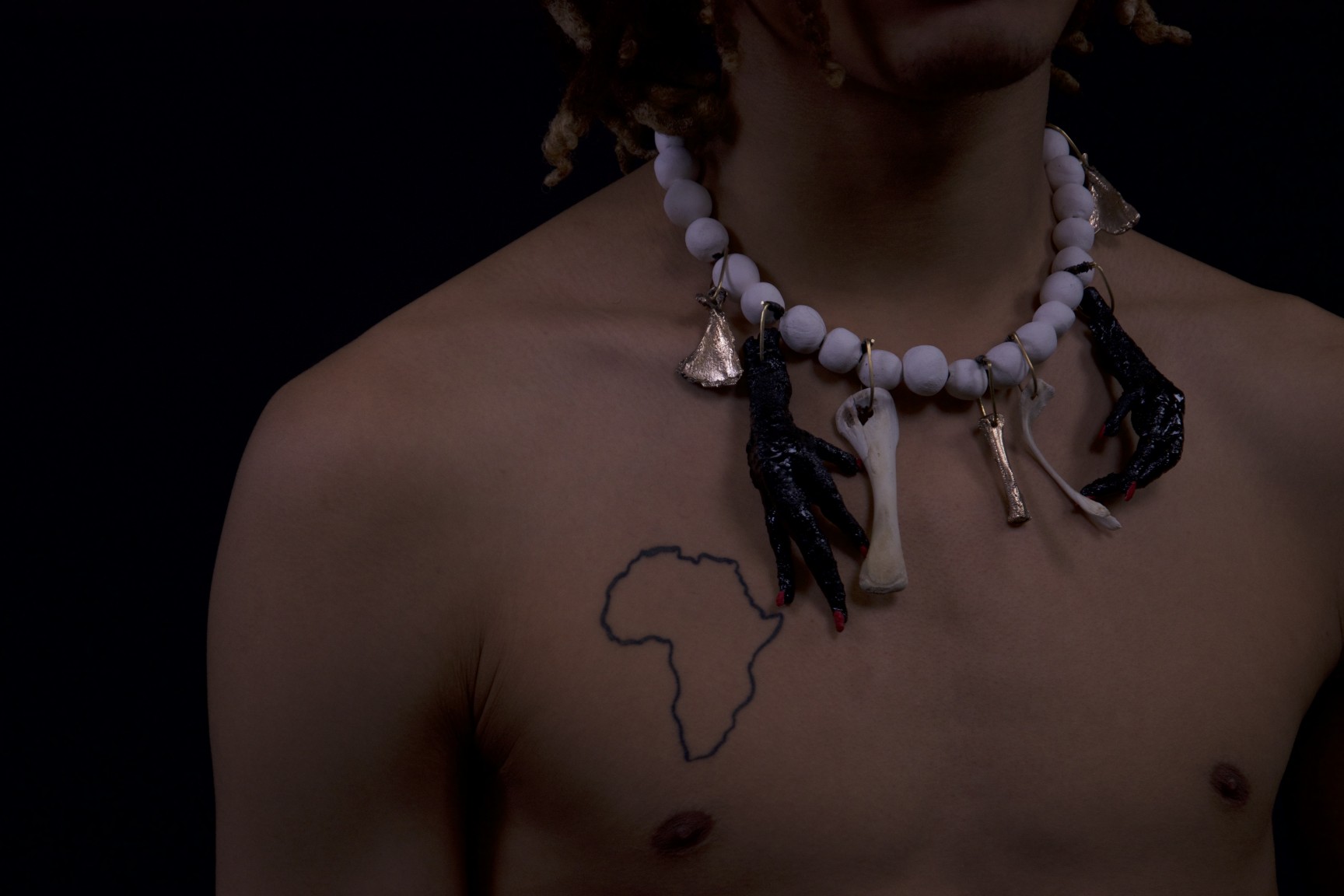 ‘Hoodoo Majesty’ is Amber Stephen’s take on a traditional pearl necklace. ‘Hoodoo’ refers to the accumulation of several cultural traditions, born from slavery; whilst ‘Majesty’ refers to the quality Stephen’s piece assigns to the animal carcasses used. The necklace is often thought of as a symbol of feminine sophistication, however this changes tone when worn by a man. Its meaning is further altered by the addition of traditional African tribal adornment- in the forms of bones and chicken feet.
