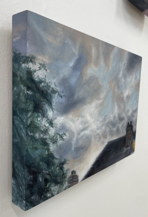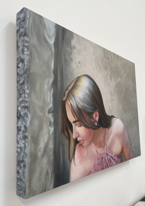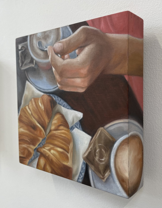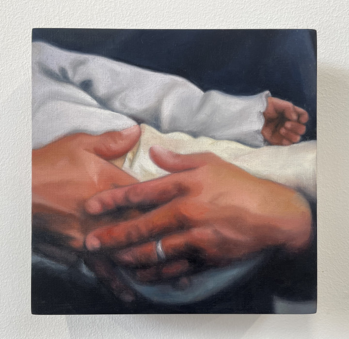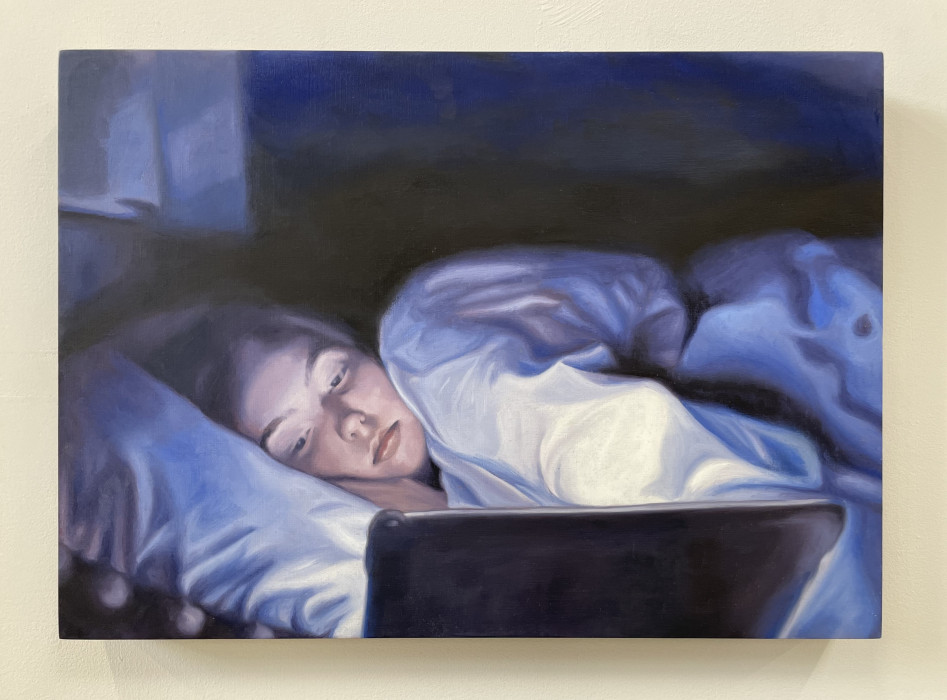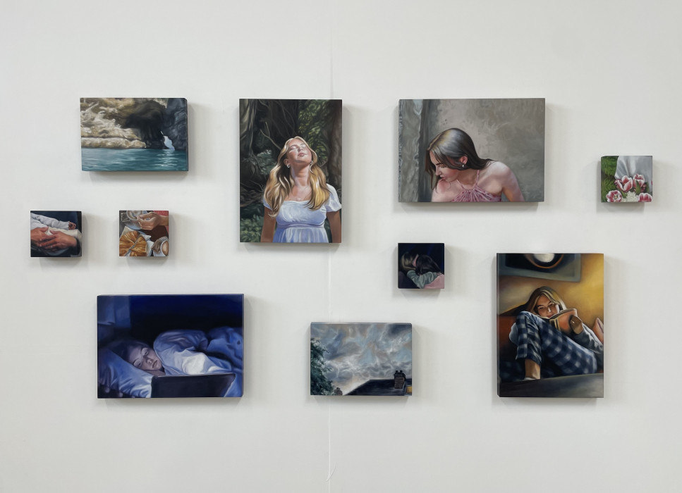 ‘I Can See Daylight’ is an oil paint on MDF series subtly exploring the nuances and paradoxical emotions felt in memories throughout Elizabeth Morgan’s adult life. In this artwork, Morgan curates a reflective journey through the mundane moments in her experiences of healing. Whilst the piece focuses on self-portraiture, Morgan punctuates the series with small-scale paintings crediting the connections, environments and interpersonal dynamics that facilitated her recovery. By animating natural and artificial lights, the artist aims to create dimension which, when considered with the intricately painted edges of each piece, is immersive and engaging. Balancing these techniques, the voyeuristic series of paintings hopes to resonate with the female gaze and challenge viewers’ to reconsider their perception of healthy emotional wellbeing.