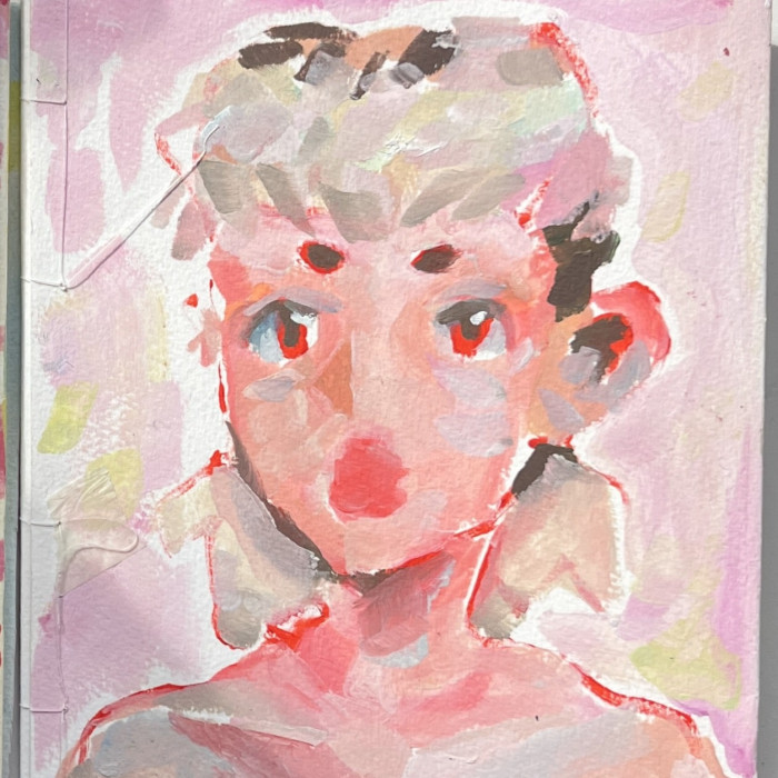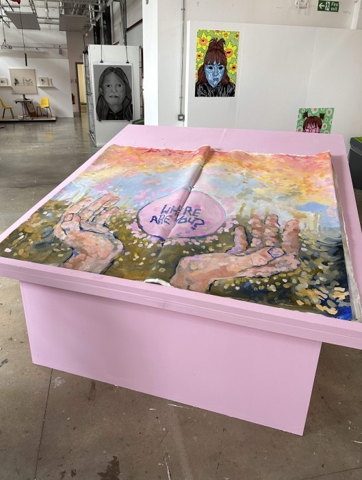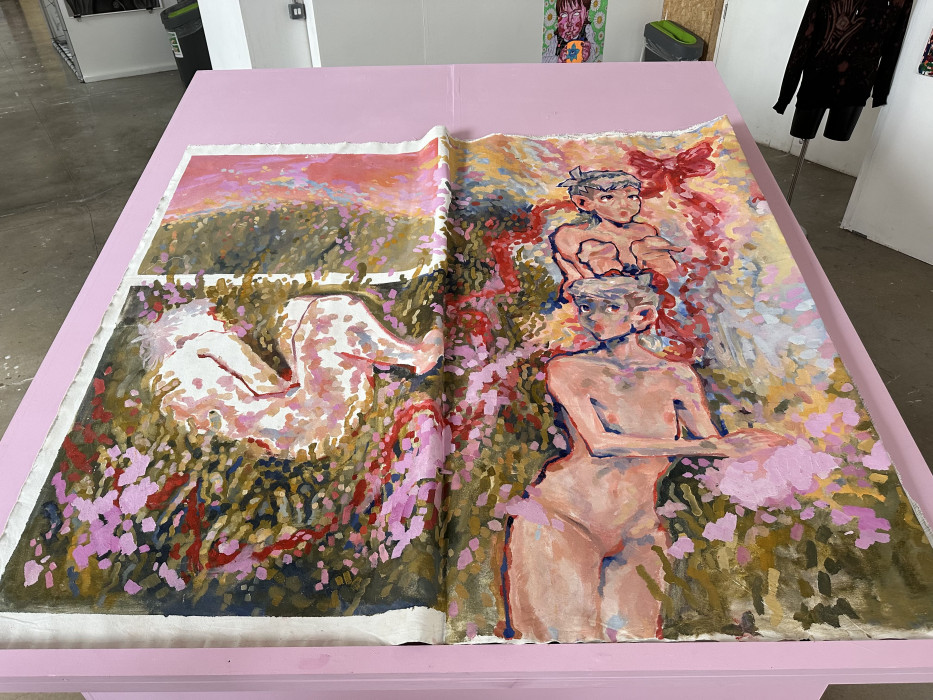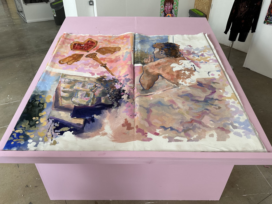 With the goal of elevating comics and narrative-based media to a “higher” contemporary art form, the piece is crafted from eight meters of canvas with inserted eyelets, allowing it to be displayed either as a scroll reminiscent of traditional scriptures or bound together to form a comic, reflecting its initial inspirations. Positioned on a two-meter by two-meter pink plinth, the artwork aims to command attention within its space while staying true to its original sources of inspiration. Through its presence, the piece prompts questions about what belongs in contemporary gallery spaces and how objects and media are perceived and treated within them.