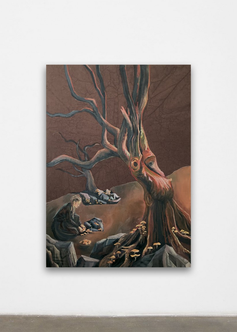 Inherit the Earth is one in a series of large-scale paintings onto hand-dyed fabrics that navigate the complex terrain of ecological grief. In particular, it explores ideas surrounding unsustainable practices within the textile industry, both its environmental damage and the social issues that accompany it. Kirsty Noble configures imagined situations, depicting real experiences of nostalgia, guilt, and loss.