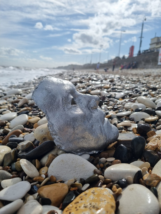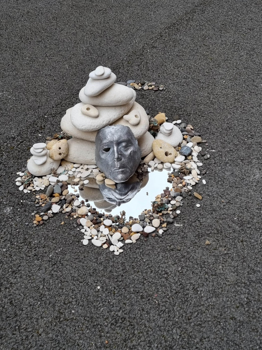 Donna Gillot’s installation includes a photo wall showcasing her cast objects within various environments, many of which hold special significance. The use of Gillott’s face in constructing the mask is not driven by ego; rather, it serves as a means of connecting to memories, documenting them, and preserving them in time through an image or natural object. It symbolises permanence, representing something solid that will not age or deteriorate