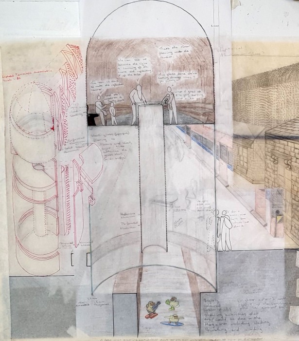 Dalton wanted to use as much natural light as possible, and so the glass tube in which the viewing platform sits, lets the light in. The light reflects, off the brightly coloured ducks, anchored under the periscope and the river water, up the inner tube for people visitors to see beneath them.