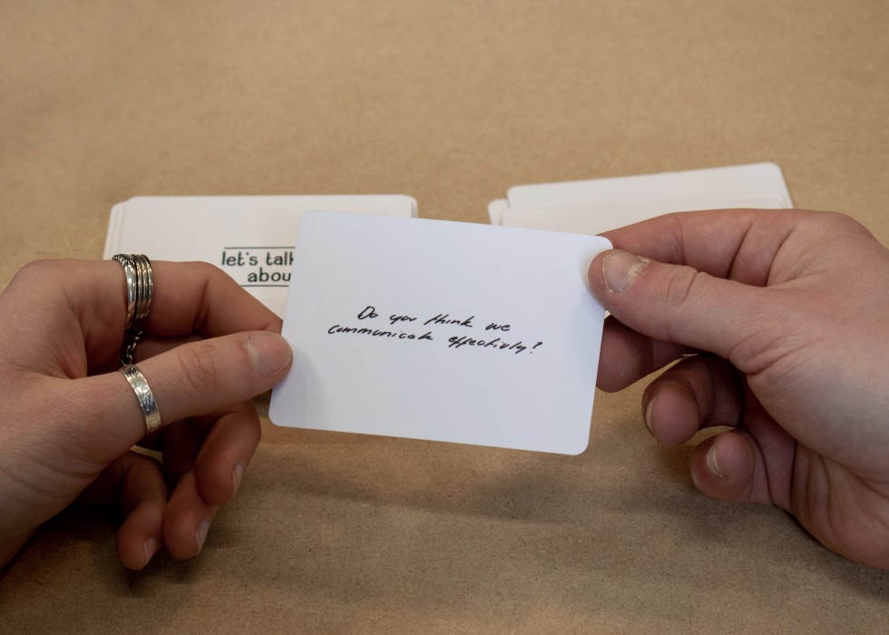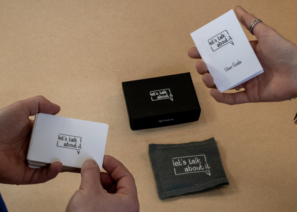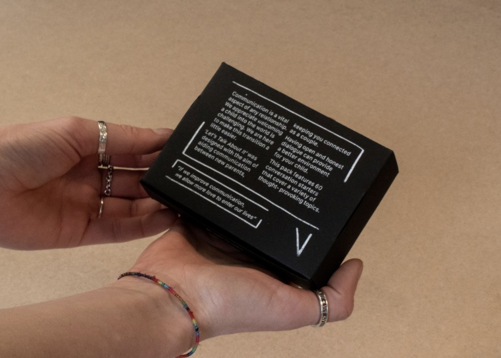 The card game was made for new parents. Allowing them the space to talk about their thoughts and feelings post-birth. 60 handwritten conversation starter cards form the basis of the game. The cards cover a variety of thought-provoking topics. From finances to upbringing and future goals. The User Guide features a ‘How to Play’ selection as well as ‘Tips’ and ‘Additional Support’ for users to access if they feel the need.