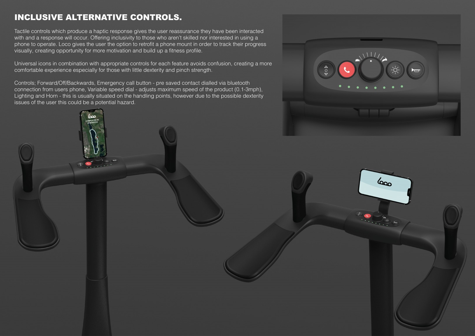 Loco focusses on inclusivity, reducing the capability demands of the product which results in more people being able to use it, improving their user experience. This ranges from those in later life to those going through stroke rehabilitation or anyone with difficulty ambulating.