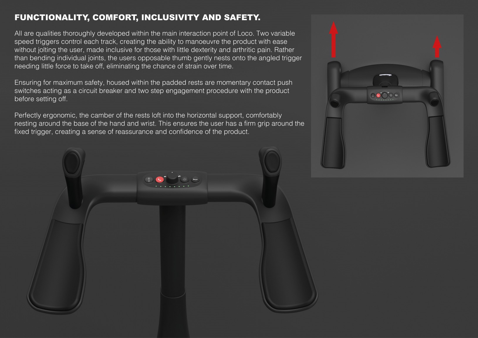 Existing walking aids struggle on rougher terrain, limiting where the user can explore which includes; cobbled paths, woodland trails and sandy beaches. To overcome this, Loco offers power assisted walking controlled via two independent triggers. This in combination with the forearm support relieves the weight of the user, enabling and encouraging them to walk further and for a longer duration, enhancing stamina and improving fitness. Loco moves via an electronic tracked system which involves a rubber tread and four smaller rollers in-between the fixed corner bearings, all powered via a sprocket chained system, sending power directly to a raised idler wheel at the front. The tracks large surface area will displace the users weight, obstacles in the way are not a problem and steep gradients are now more accessible ensuring a smooth ride. The gyroscopic sensor and accelerometer create a sense of reassurance, notifying a pre-saved emergency contact if an accident has occurred. However, having a low centre of gravity makes it easier for the user to raise it back up.