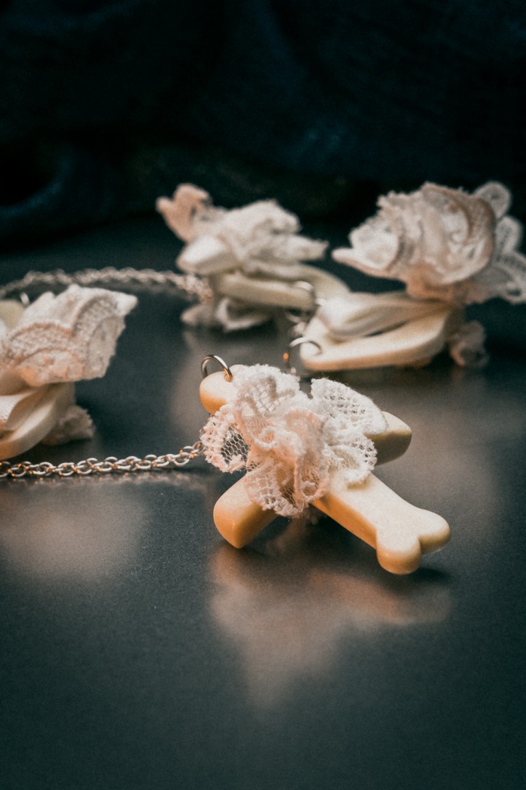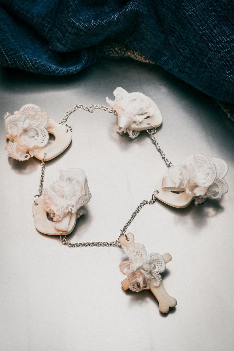 ‘Mourning Bone Necklace’ is inspired by the grisly 2016 news story in which a Russian woman murdered her husband and fed his remains to her dog. Chen made this work out of cattle bones to represent the bones left after the dog has consumed the remains, with the lace flowers referencing the ribbon on the dog’s saliva towel. The piece aims to immortalise the husband’s story, paying tribute and sympathy to his death.