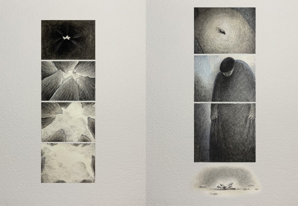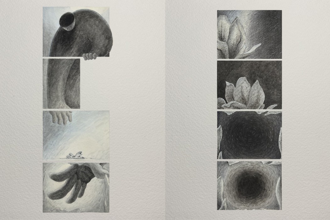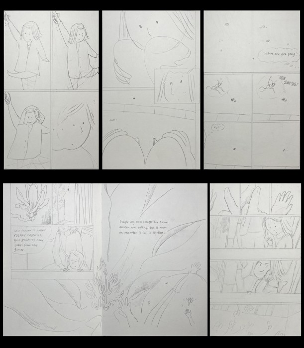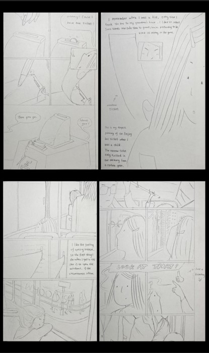 In this final project, the author mainly focuses on family affection and love. The creation of the graphic novel is based on the origin of her grandma’s name. Xiaozhao Ban chose this topic because she has never tried it before, it required focus not only on the drawing, but also on storytelling and narrative. In addition, she thought the combination of many graphics and texts in one page could give readers a richer visual experience, such as feeling the changes of time, movement and emotion. She hopes that through this work, audiences can feel the fluctuations in their hearts, and let them feel the power of family affection from the book.