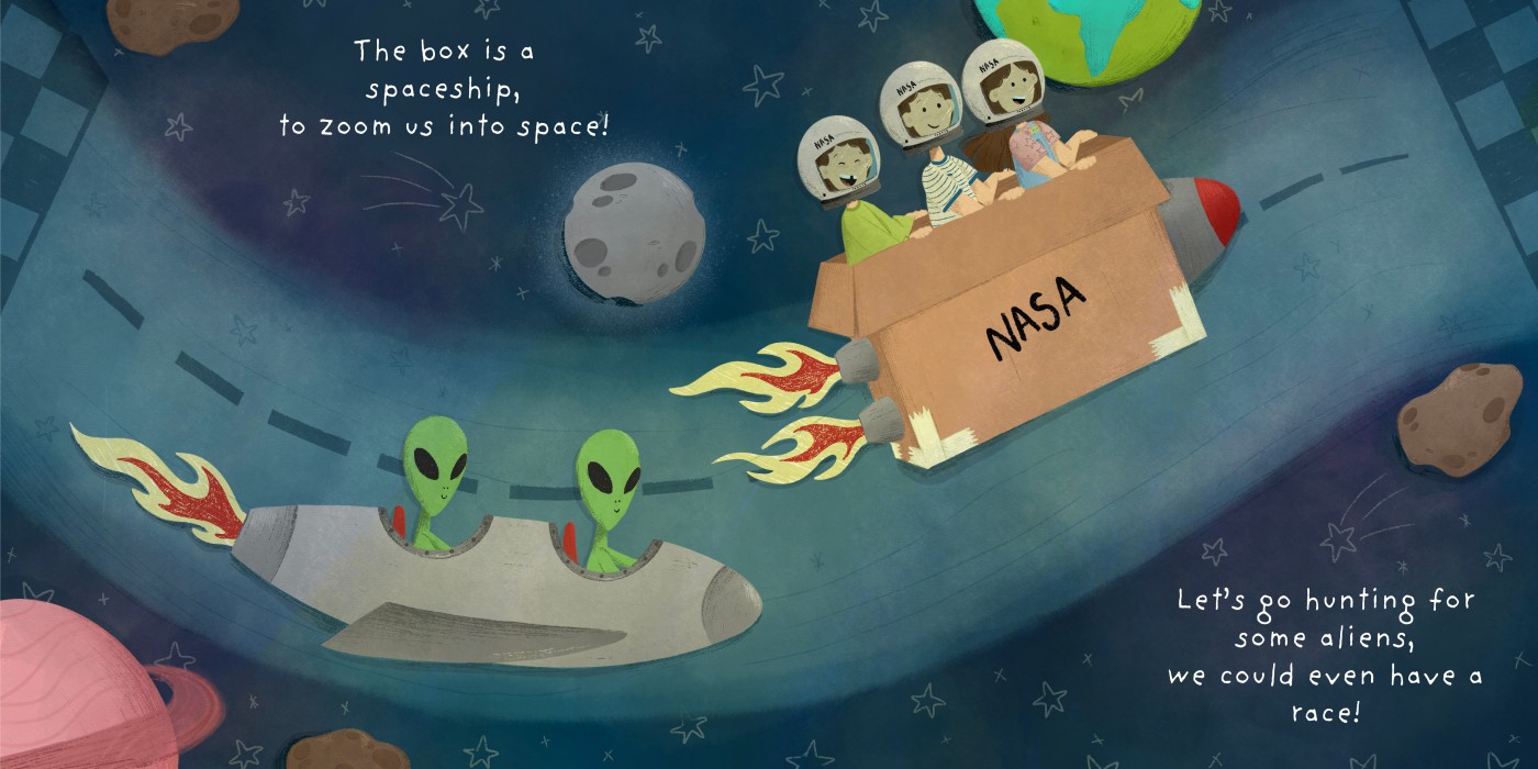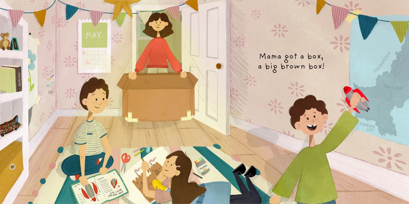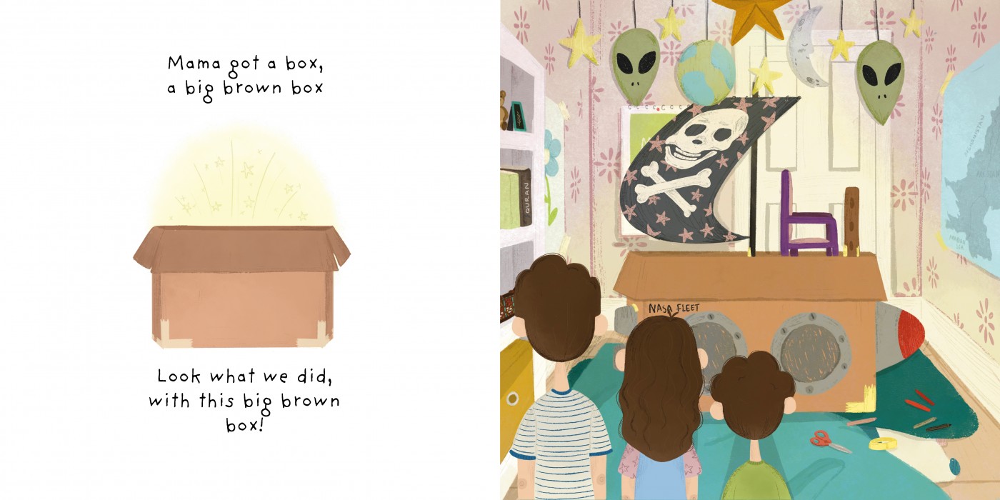 Mama Got A Box is an illustrated children’s picture book by Helena Towell created for Writing On The Wall, with the story by author Jennifer Khalil. The book follows the adventures of three young siblings as they debate about what to create out of a big brown cardboard box – highlighting the unlimited wonders of childlike imagination and creativity. Using detailed and bright illustrations, the book brings the story to life by illustrating the children’s debates over what to create, ultimately teaching the importance of working together to create the pirate-ship-princess-castle-space-ship of their dreams.