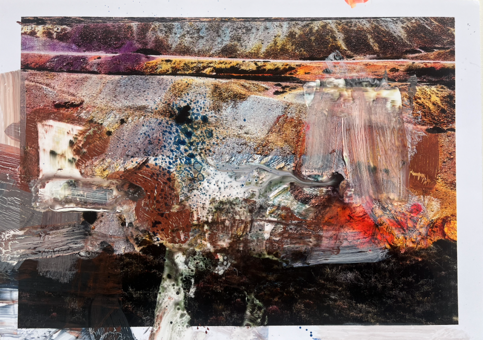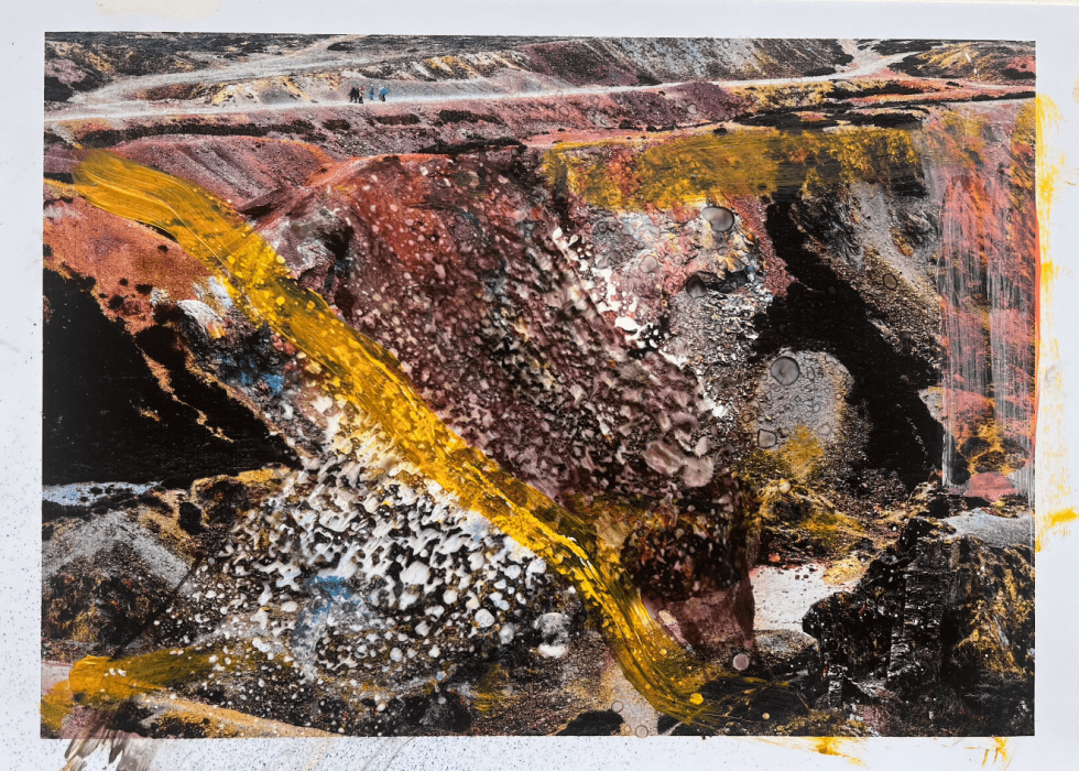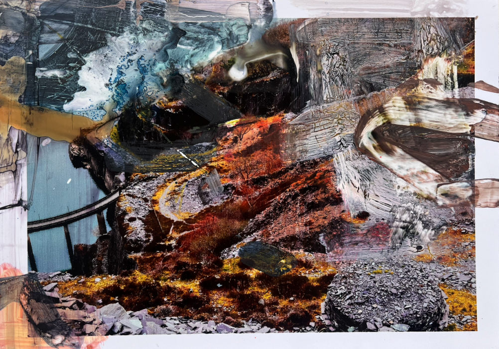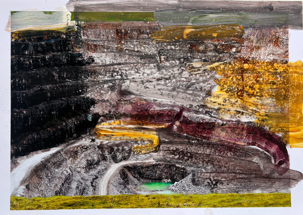 Margins of Extinction is a response to the trauma of climate change. In contrast to traditional landscapes depicting humanity’s serene coexistence with nature, Margins of Extinction shows a series of ‘wastescapes’ which register the sublimely abject aftermath of the ongoing destruction of the natural environment. These works bring together semi-abstract images of vast industrial quarries and mines located in the Peak District and North Wales with painted marks resonant of the primal traces of early human interaction with the land. Using processes of creation, destruction, and reconstruction they form a set of palimpsests symbolising the land’s disfigurement and erasure by contemporary humanity.