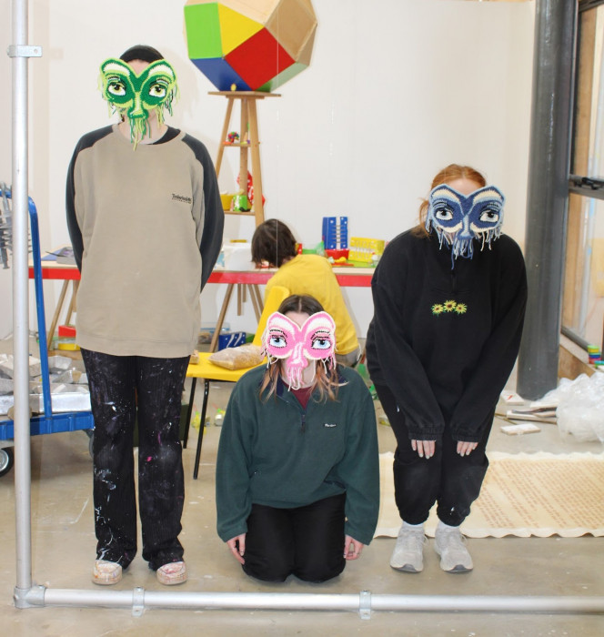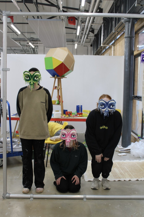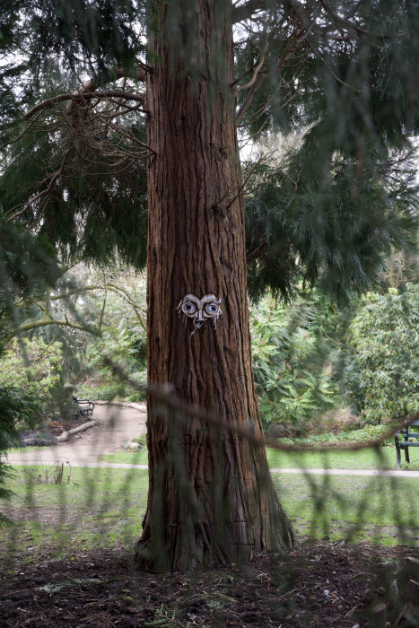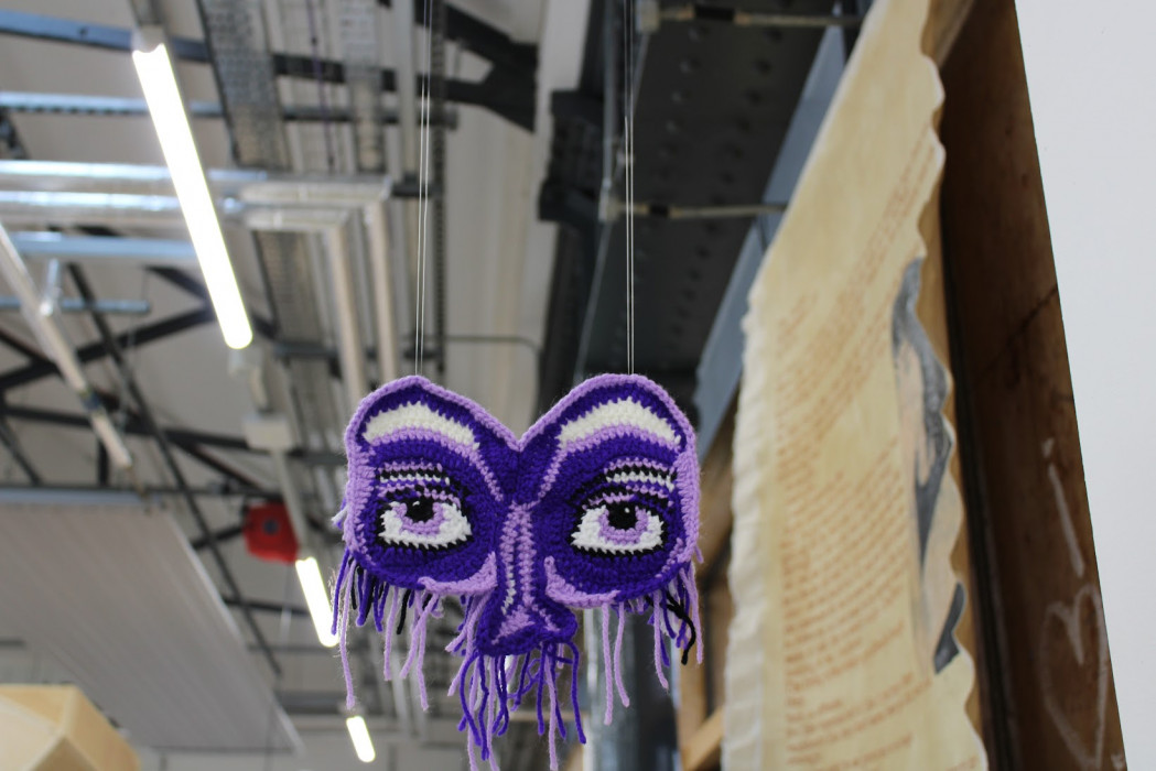 A series of four crochet masks hung up with fishing wire on a scaffolding structure. Ellie Marcou wanted her piece to be interactive so people could stand behind the masks and have their identity become anonymous. Marcou left the loose threads dangling as she has been exploring showing the process in a professional space such as a gallery. Alongside this, she has included an image of one of her works on a tree where she was exploring the theme of transformation and making inanimate objects appear human-like.