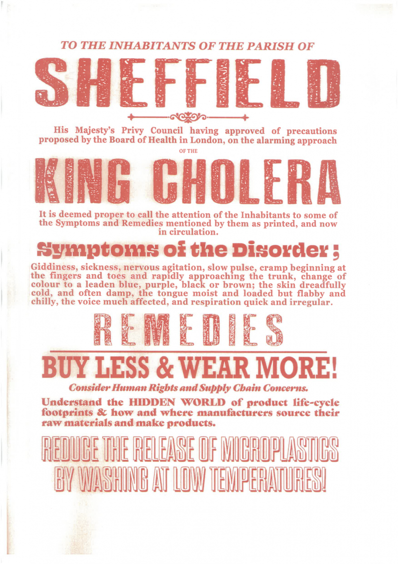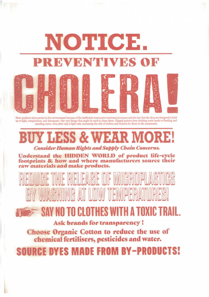 Alongside this, McEwan highlighst lethal manufacturing methods and how they severely impact humankind, designing two posters suggesting that the Cholera pandemic is back due to contaminated and clogged waterways.