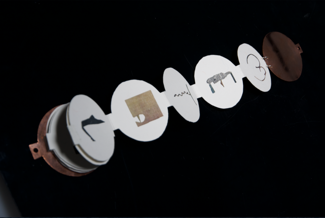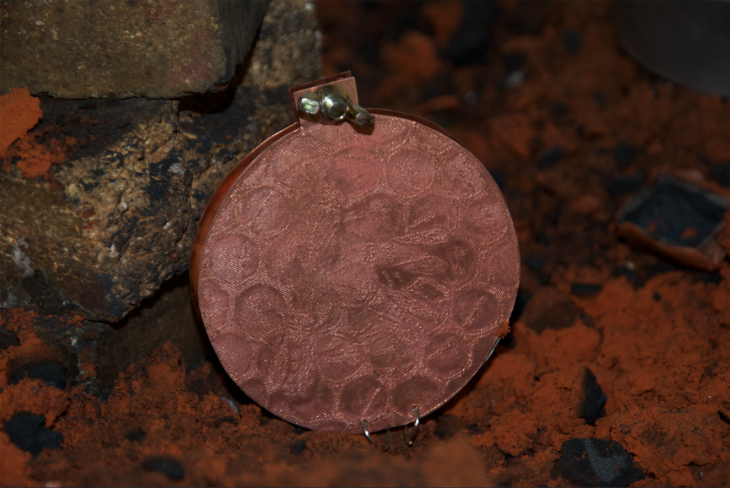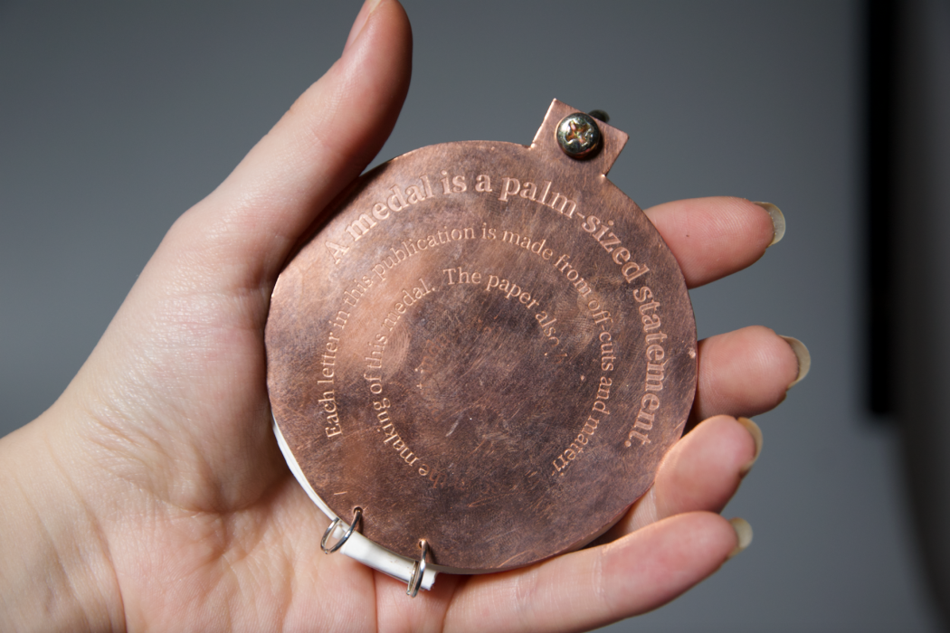 The metal covers contain a photo-etched image of the final medal (front) and a quote from the Jewellery student, “a medal is a palm sized statement” (back). The size and shape of the publication was also inspired by the medal, with the intention of making a statement about the amount of work and iterations that go into the objects produced on the course.