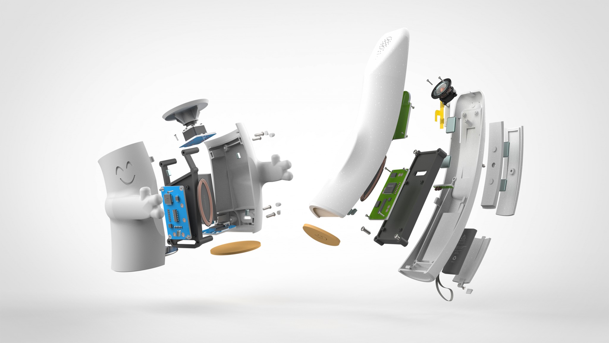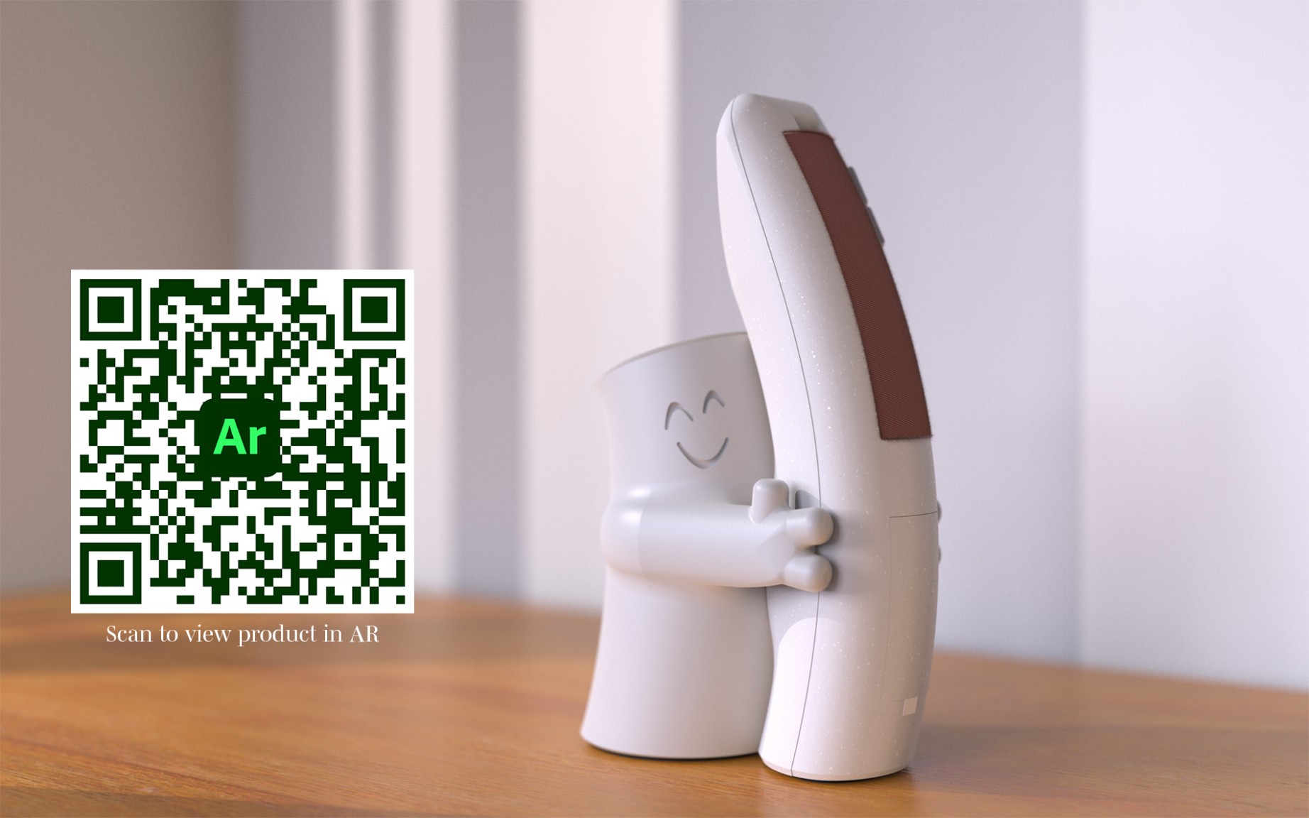 The product is made of two parts, the character and the handset. The handset is used by the dementia patient to read RFID tags that will trigger a message about the specific photo it is attached to. The character is used to charge the handset while it is ‘hugging’ it and has been designed in a way to encourage the handset to be returned to its ‘friend’. The product also includes a material panel that will use a material of the user’s choice for them to better attach with the product.