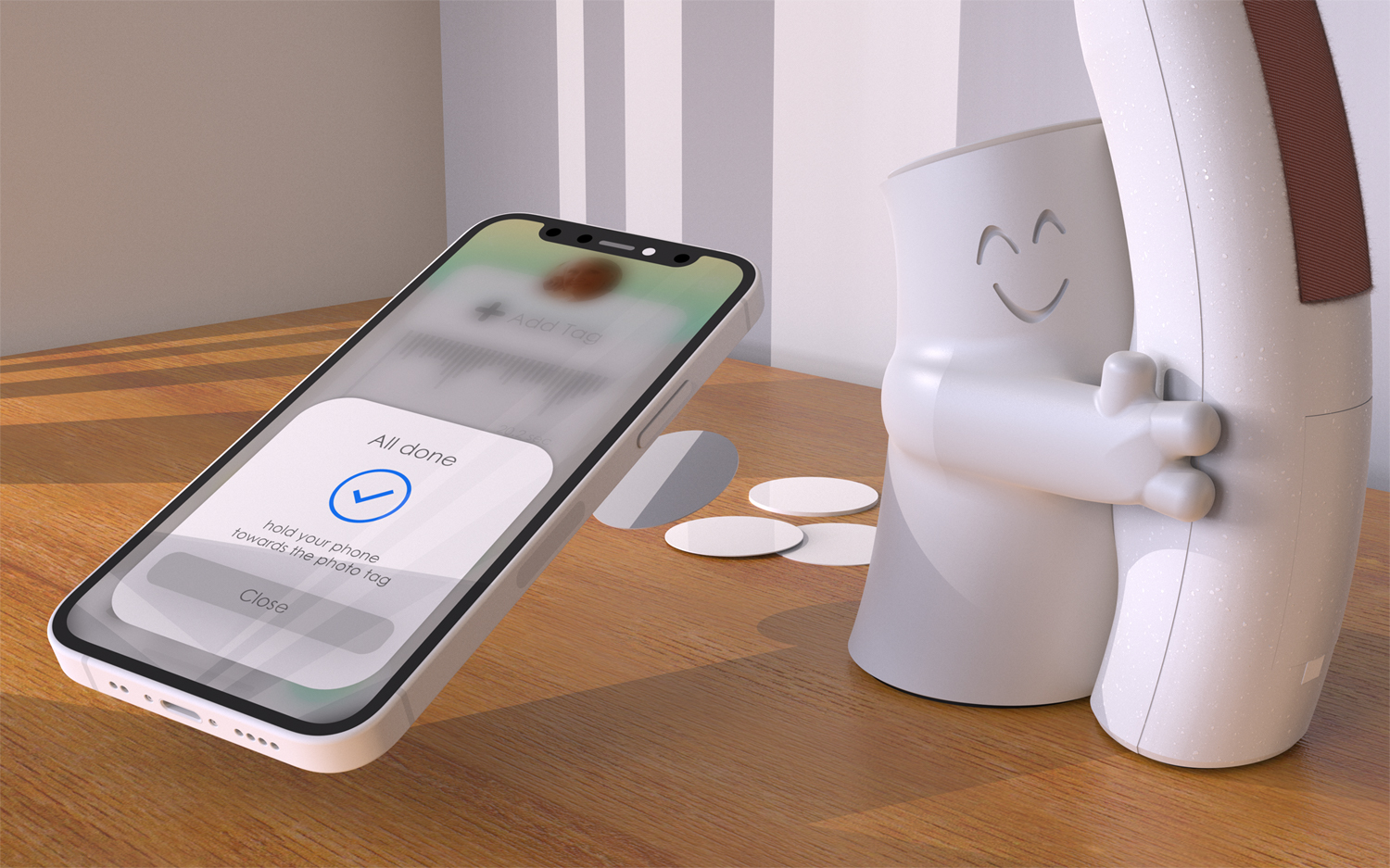 The app is to be used by the carer to record messages and upload them to RFID tags for the product to read, using a smartphone’s NFC sensor. The messages will be stored on the product’s handset and the tags will be used to tell the handset which recording should be played. The service also offers a space for a carer to seek professional support and track the product if a dementia patient was to walk away from the house with it.