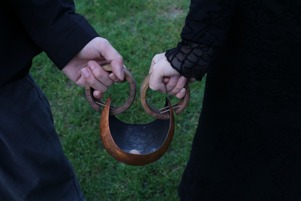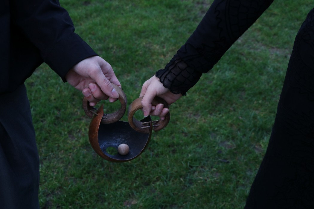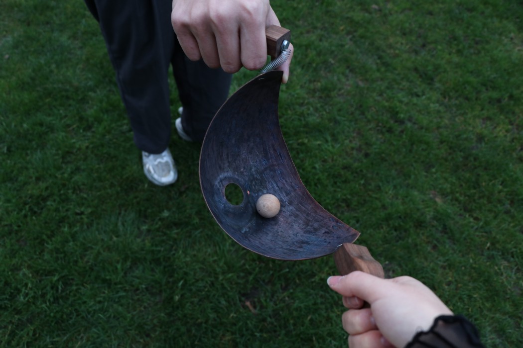 Press and Revolve, 2024. Silver, wooden balls, wool felt,