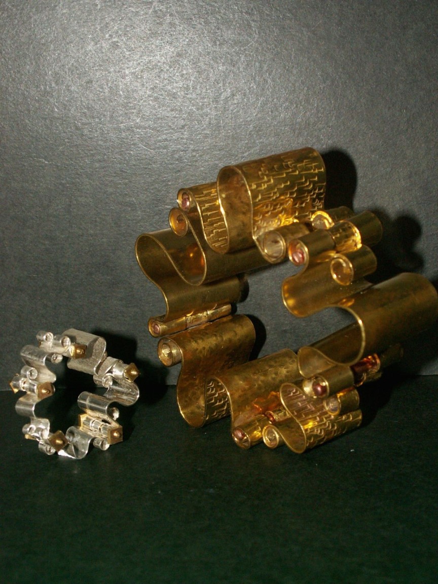 Joanne Kwok believes that true beauty can be realised through natural materials and textures. Her collection ‘Nature Collection’ consists of rings in curled metal strips combined with local tree bark and seed all featured in a container with a hammered, bark-like texture.