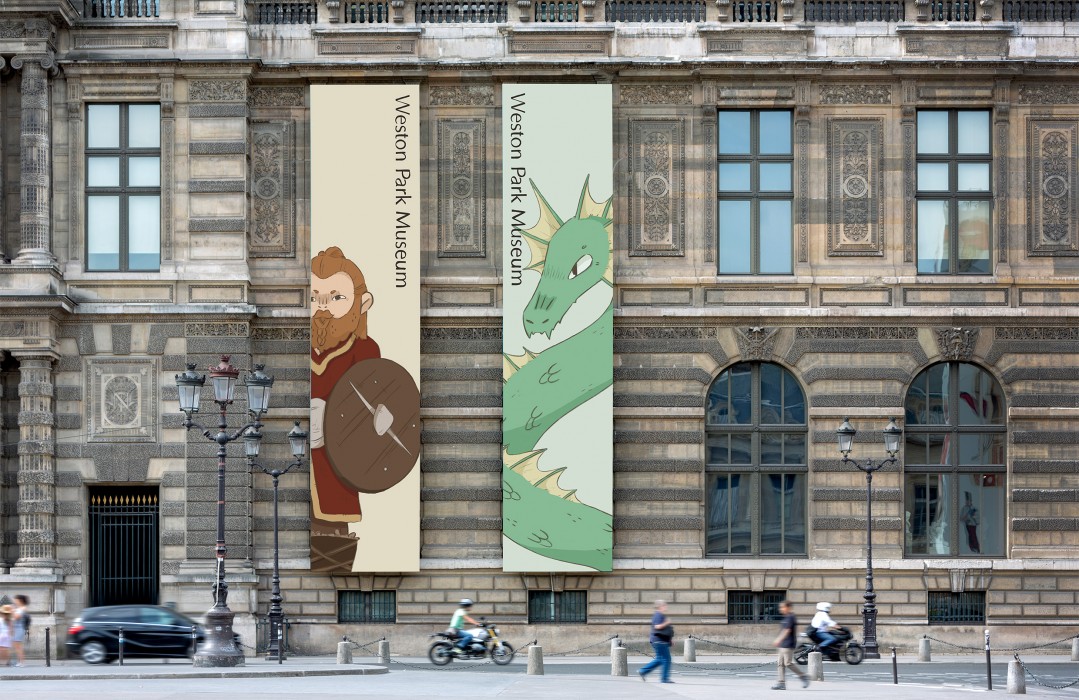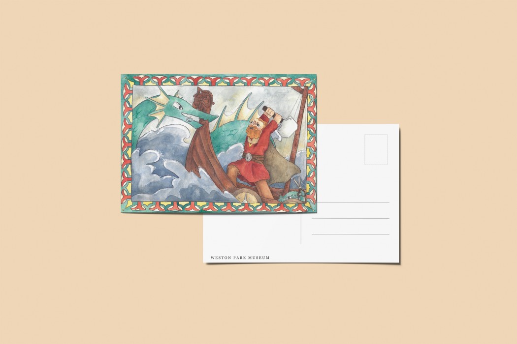 Through various development techniques, Chloe Walsingham has explored the characters of both Thor and Jormundgundr, so as to be able to use them across a variety of outlets which each hold their own purpose. For example, the most notable outcomes include a wall tapestry which depicts the final conflict of “The Fishing of Jormundgundr”, as well as advertisements for the exhibition, and an interactive activity for guests during the event.