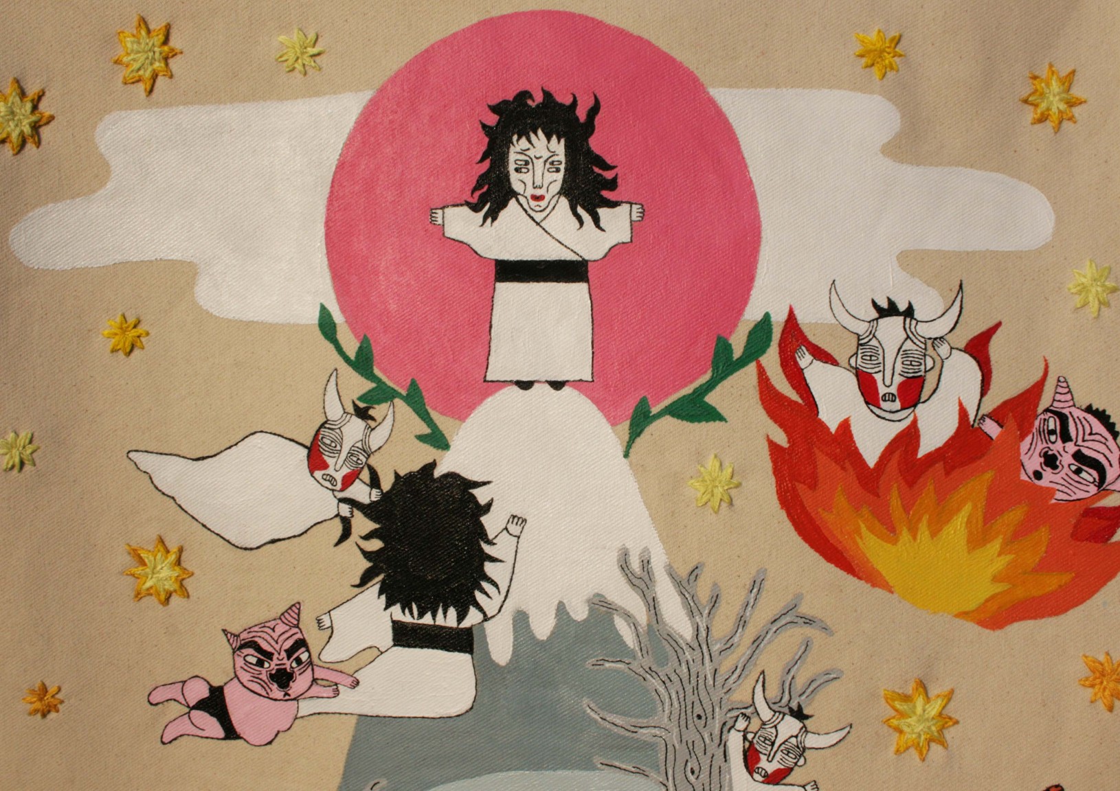 Emma Stevenson has created a traditional narrative scroll to explore Women’s place in Japanese culture. This project is based on a modern Japanese concept called ‘Onna Wo Suteru’ or ‘giving up on being a woman’, which puts pressure on Japanese women to look a certain way. Stevenson has combined this contemporary construct with traditional views of women in Japanese folklore to create a narrative following a Japanese woman climbing up a mountain, whilst characters trying to prevent her from doing so – something women in Japan can still be banned from doing today in certain places, due to the stigma attached to menstruation. The woman comes out triumphant and the story ends with her reaching the top of the mountain, while the characters that oppressed her perish.