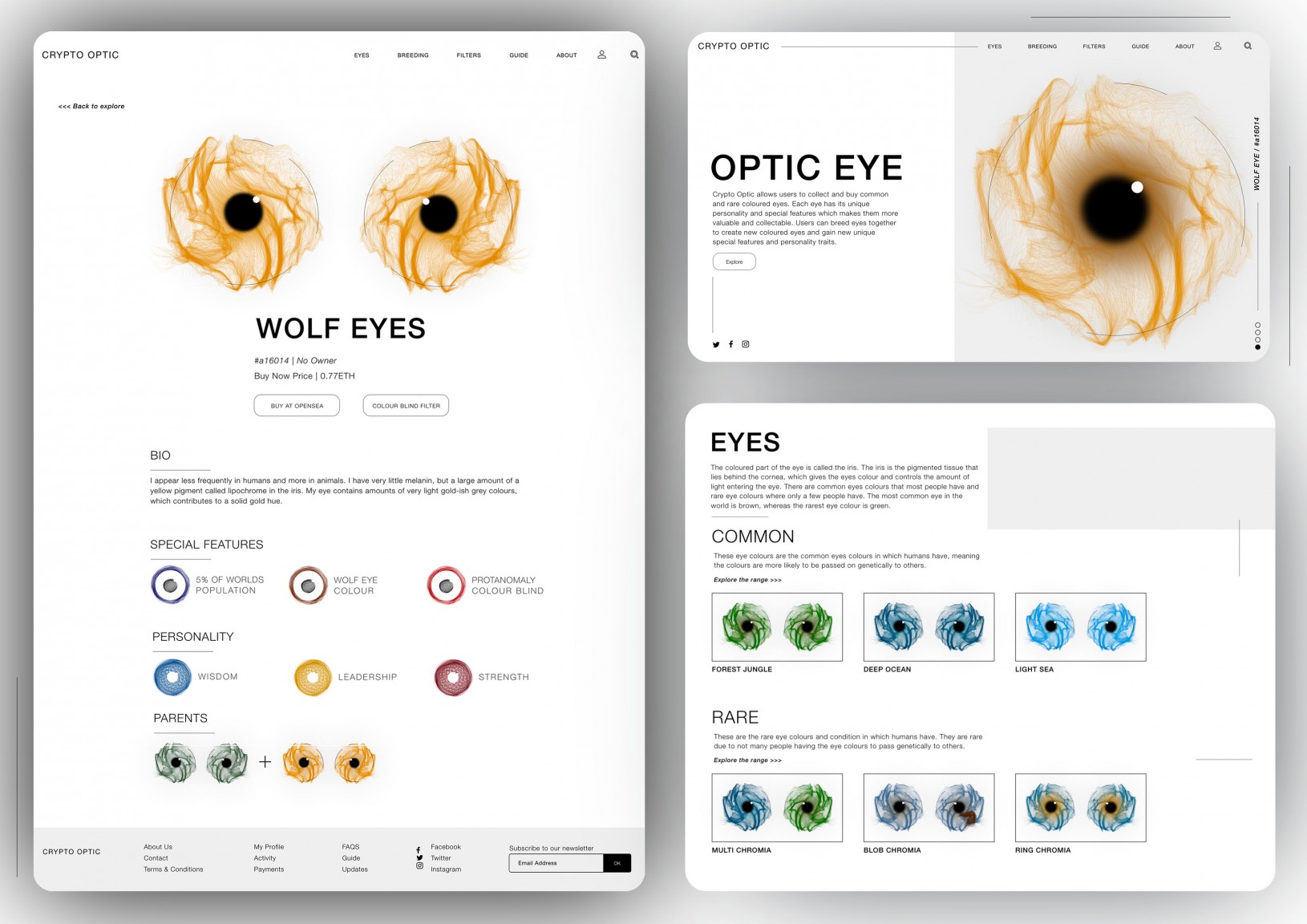 Optic Eye includes an interactive website which allows users to ‘breed’ eyes creating another set of either common or rare eye colours. The website also allows users to experience how each pair of eyes can ‘see’ – for example if a particular condition results in vision loss, the user will see a blurred filter. The website allows the eyes to be traded on the Opensea platform.