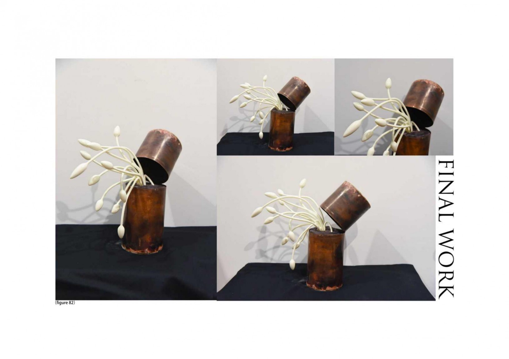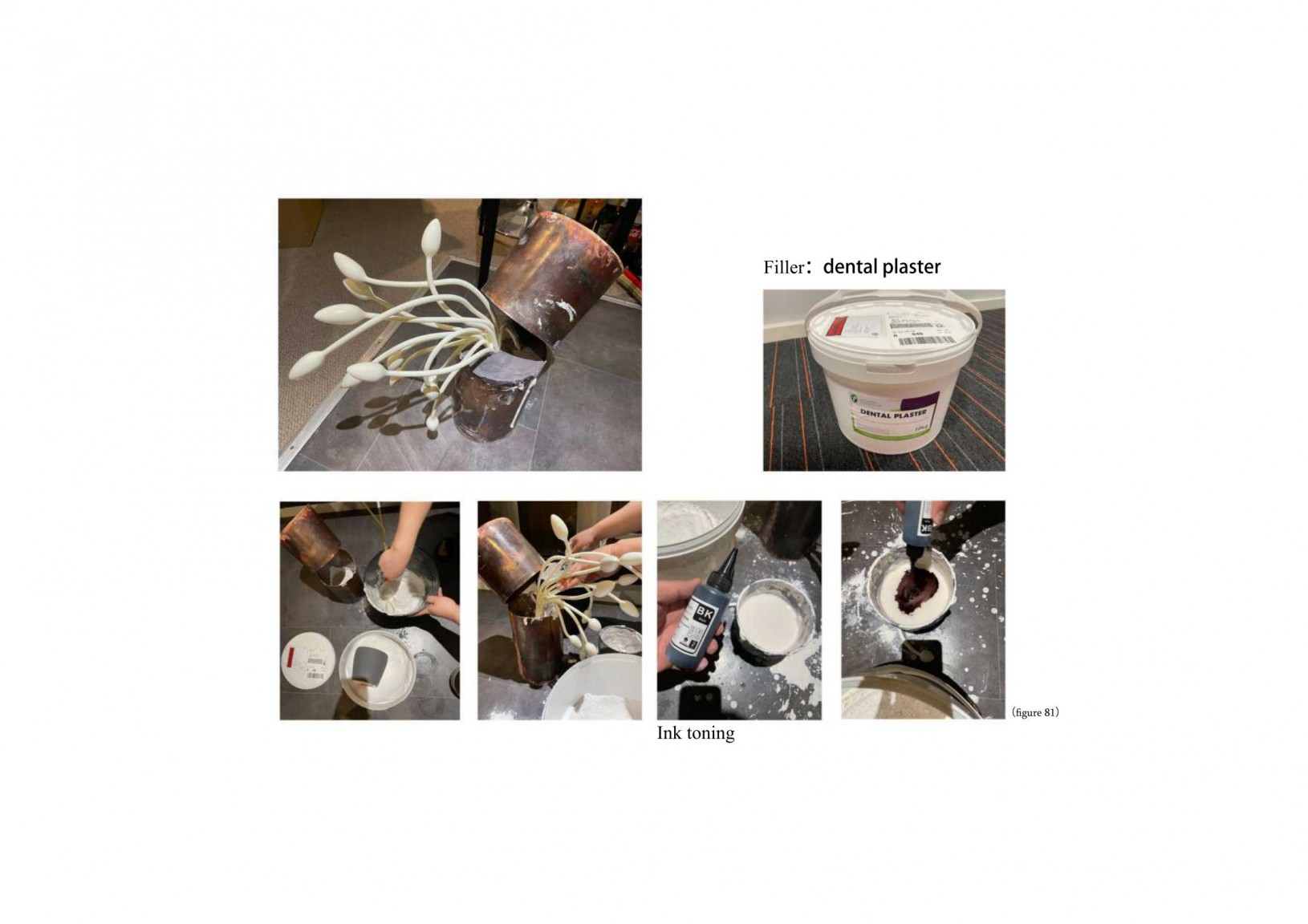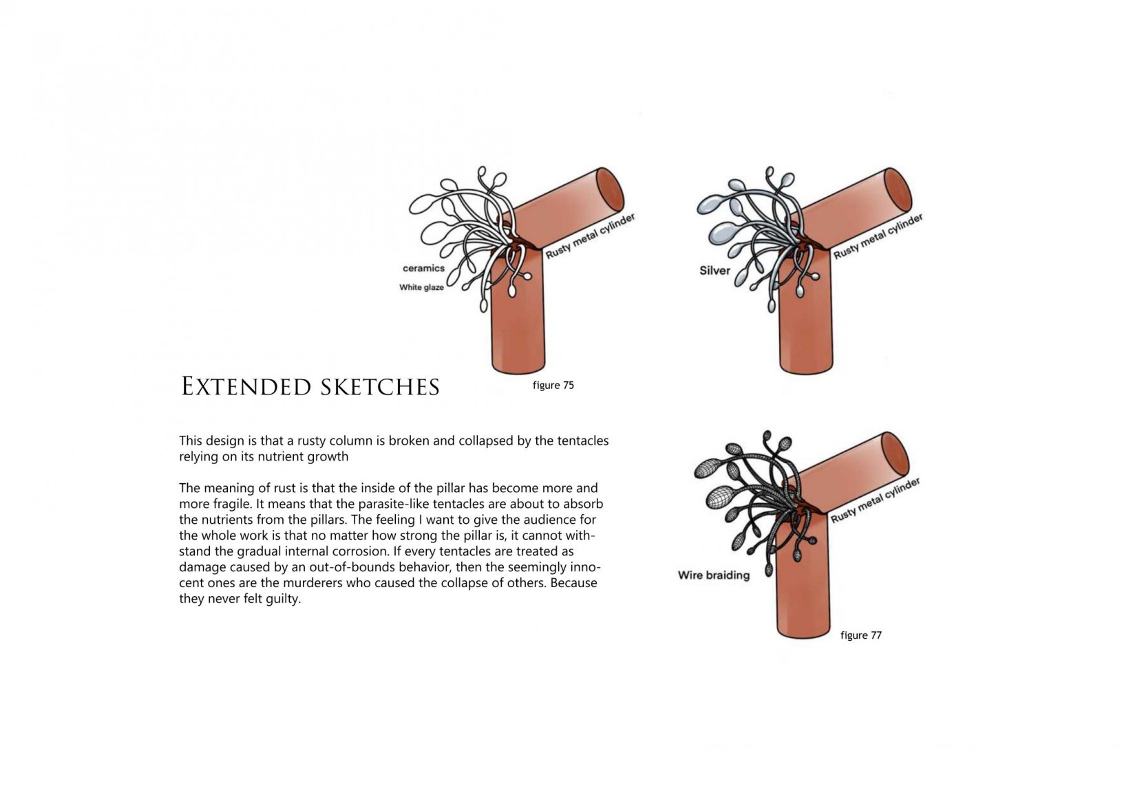 Wu as designed a rusty column, broken and collapsed by tentacles which depend on the column for growth. The meaning of rust emphasises the pillar’s fragility in the face of gradual internal corrosion. Wu notes “If the tentacles are treated as damage caused by an out-of-bounds behavior, then the seemingly innocent ones cause the collapse of others”.
