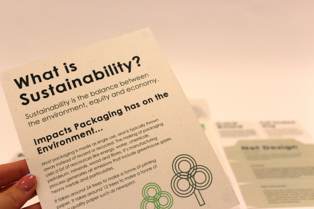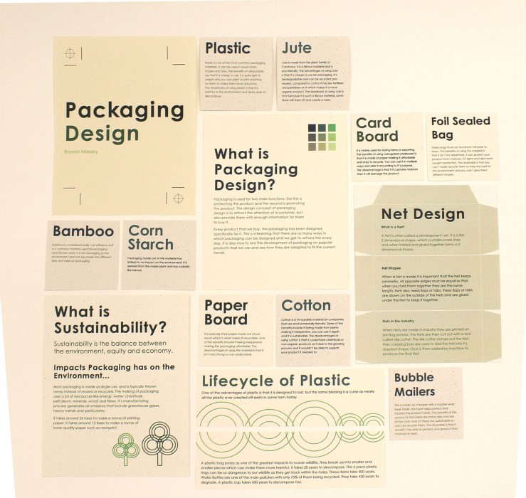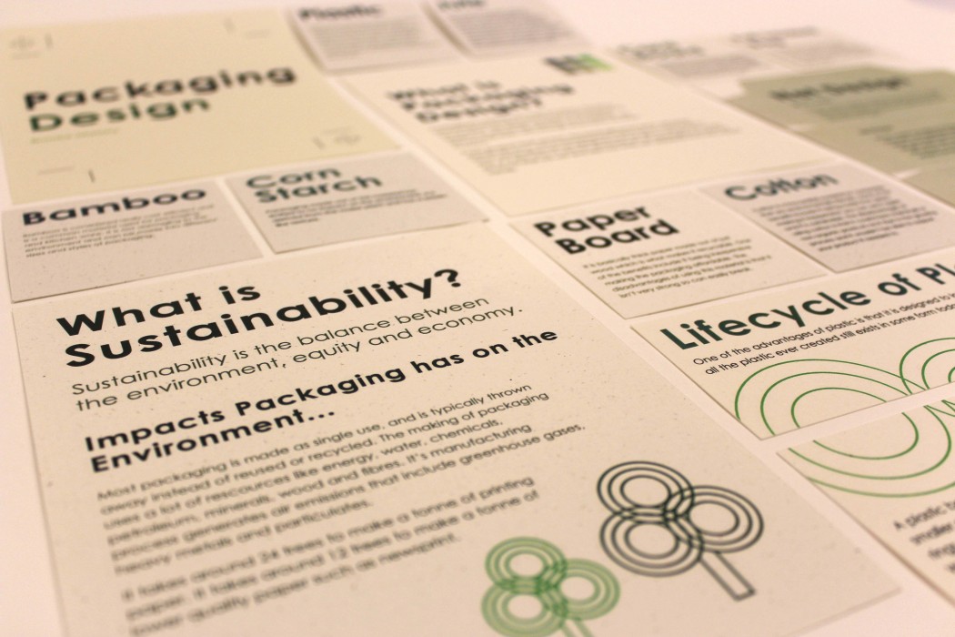 The paper used for the Packaging Publication is all recycled, as Massey aimed to design this project with the environment in mind. The type was also carefully chosen for it to have a good impact on the environment. The type used is “Century Gothic”, this type doesn’t use a lot of ink when printing so was one of the best options for the publication.