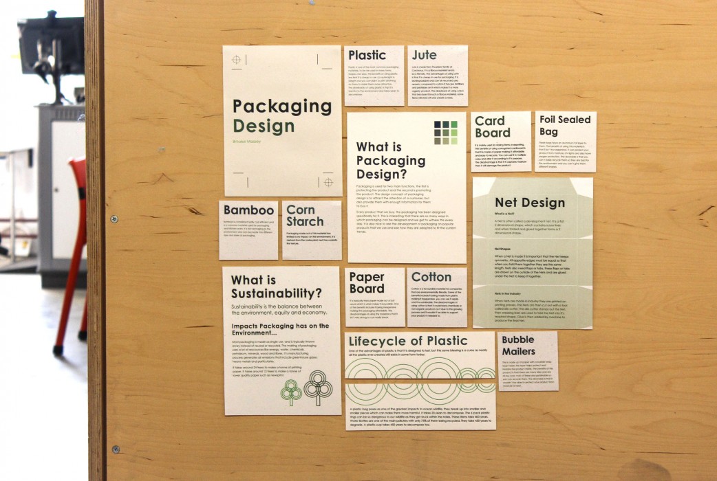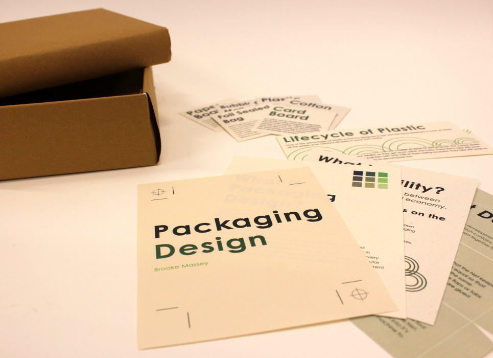 The Packaging Publication was created by Brooke Massey, to inform designers about packaging design, and to provide information on materials that can be used. The publication comes in a box with samples of packaging materials inside. This is so the owner can put the Packaging Publication up on a wall, creating a creative workspace for packaging design, but can also so it can be taken down and kept safe inside the box.