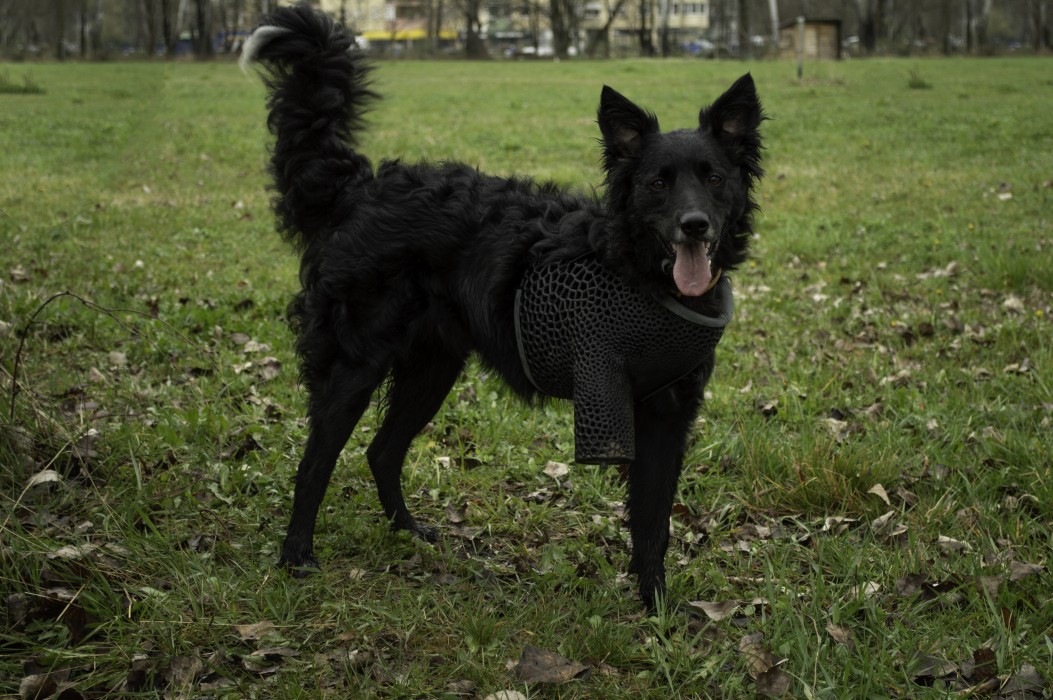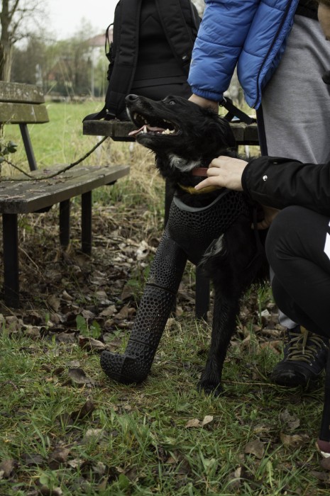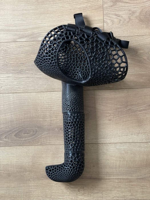 Pawsthetics is a service/company that offers fully customised prostheses for pets designed by Kristina Drmic, final year student, as part of a major project. After conducting interviews with prosthetists, veterinary medicine students and designers for health, a family in Zagreb, Croatia, was contacted to see if they were interested in a prosthesis to be designed for their three-legged dog Leyla. The owners were more than happy to participate and a meeting was organised to explain the process and their role in it. Not long after, the owners created a cast of Leyla’s torso which enabled an accurate image of her body later used to design the body jacket. Once the cast arrived in the UK, it was scanned with an accurate 3D scanning software called PolyCam and imported into the Meshmixer, a CAD software used to do post-scanning cleaning and designing. Alongside with the two bottom parts called the tube and the foot, the body jacket was imported as a mesh to a CAD software for advanced manufacturing called nTopology where it was processed and exported for 3D printing. The final product was 3D printed in TPU (Thermoplastic polyurethane) using the FDM Stratasys 3D printer located at the university. After 13 days of 3D printing, the prosthesis was soaked in an alkaline bath to remove the support. To provide firm fitting, great quality Nylon straps have been added to the body jacket and the whole product has been assembled with rods and screws.