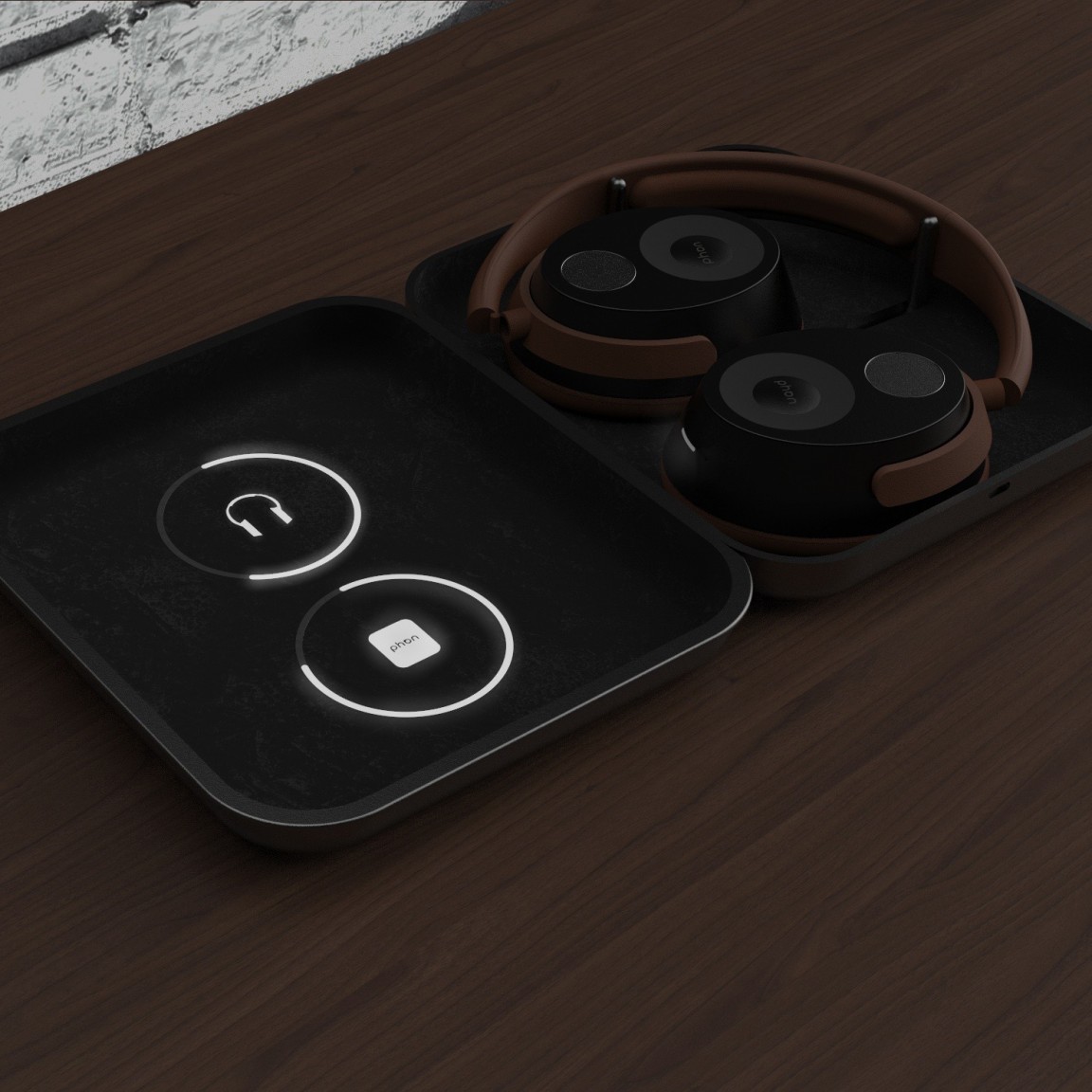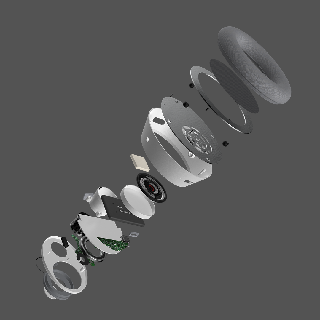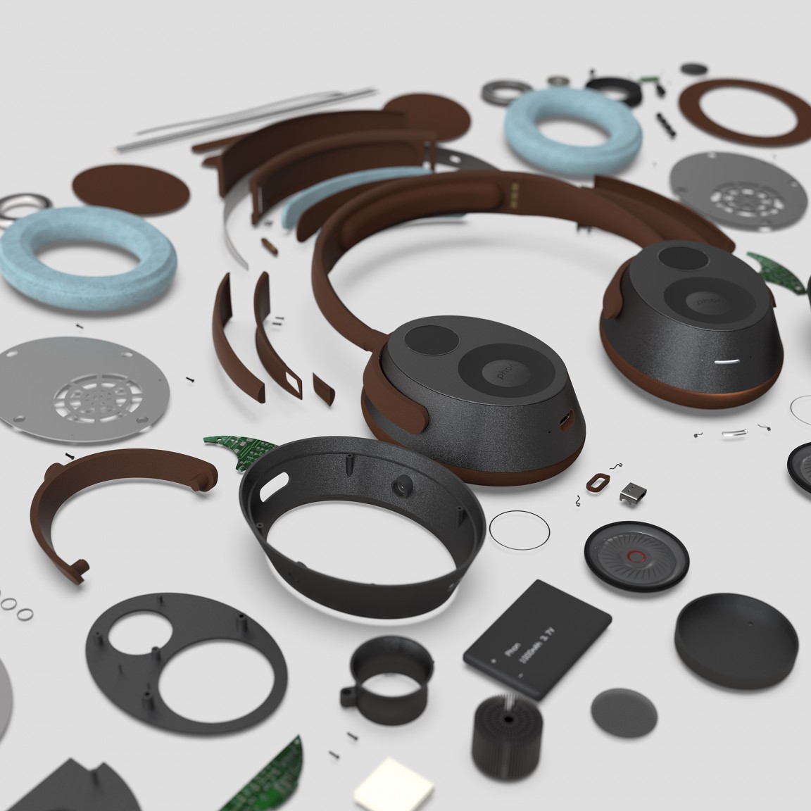 Phon is a pair of over-ear headphones specifically designed for comfortable use in warm environments or while working out, with an emphasis on intuitive user operation, and product longevity. Tim Sutton-Brand’s research showed a huge potential for a product in this category, with almost all sports headphones on the market being of the in-ear style, despite over 2 million people in the UK alone using over-ear headphones at the gym regularly. This issue of discomfort while wearing over-ear headphones is a problem that can be even worse in warmer climates, with this warmth causing excessive sweating around the ears and head. Phon includes a thermoelectric Peltier cooler system which cools down both the air around the user’s ears, as well as the graphite-gel infused memory foam that makes up the thick cushioning in contact with the user’s skin. A heat sink and exposed vent allow the thermal energy to escape from the closed system. Focus groups shaped Phon’s intuitive control system with self-orienting left/right earcups, rotating wheels used to control volume and media playback and automatic turning on/off when the headphones are unfolded.