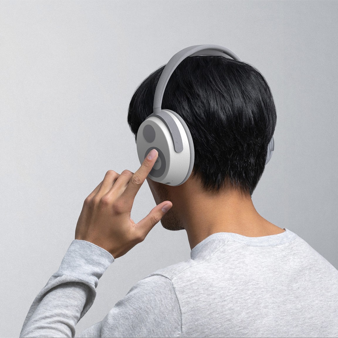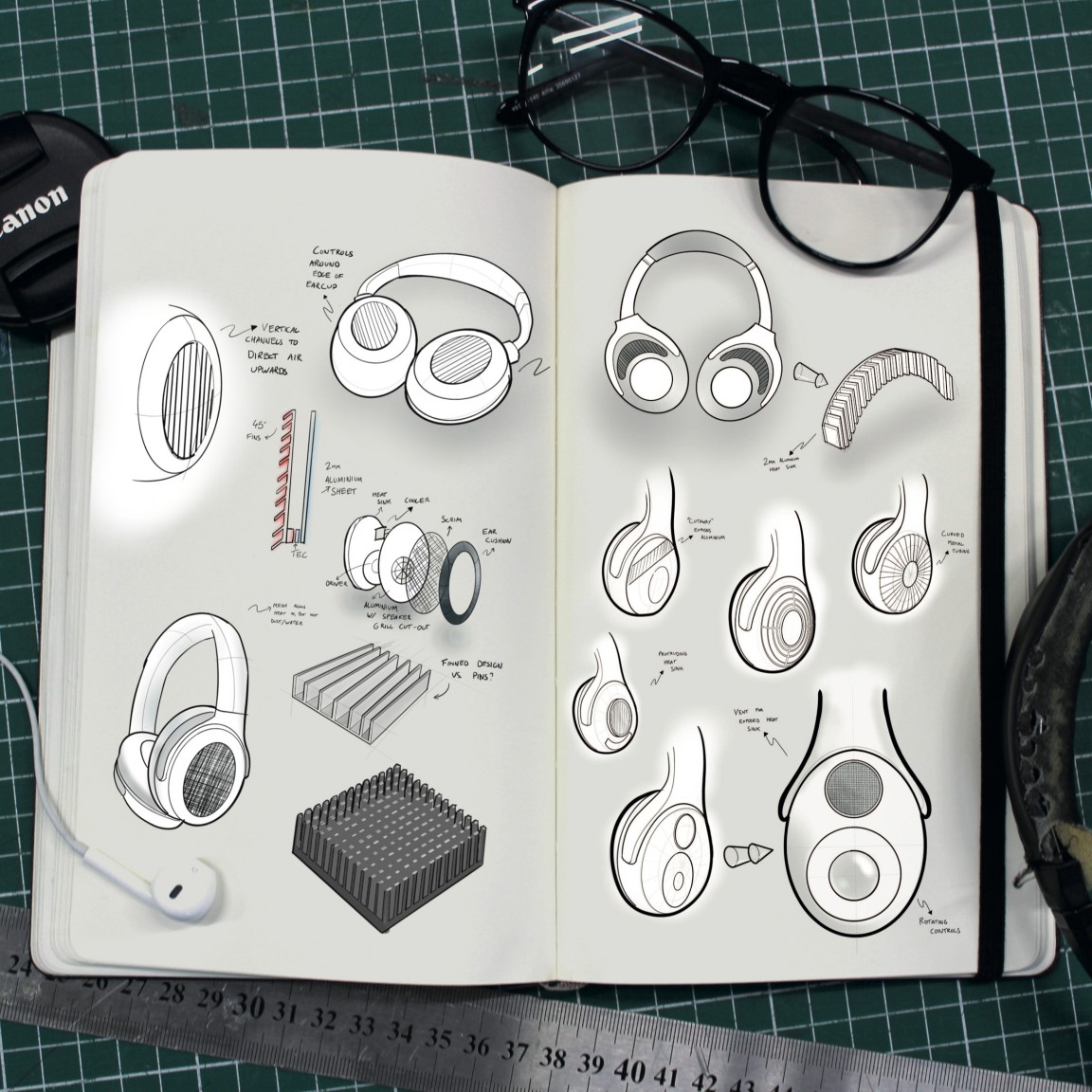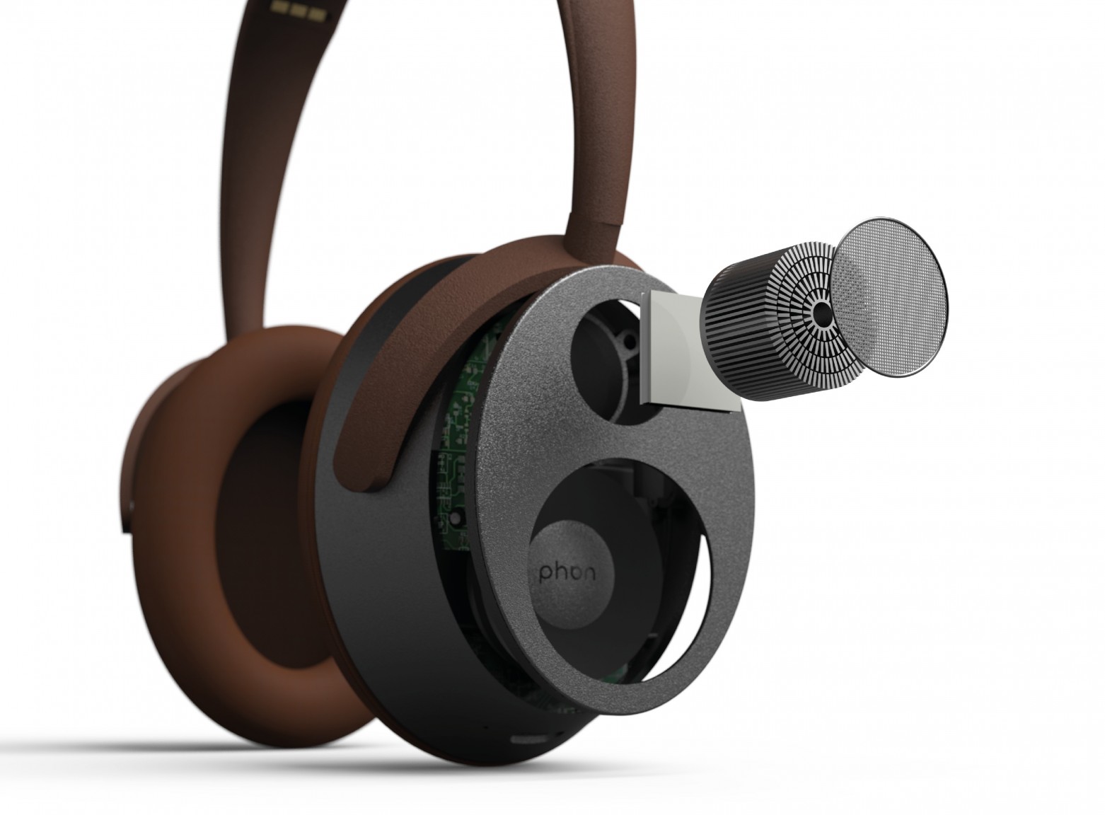 Phon is a pair of over-ear headphones specifically designed for comfortable use in warm environments or while working out, with an emphasis on intuitive user operation, and product longevity. Tim Sutton-Brand’s research showed a huge potential for a product in this category, with almost all sports headphones on the market being of the in-ear style, despite over 2 million people in the UK alone using over-ear headphones at the gym regularly. This issue of discomfort while wearing over-ear headphones is a problem that can be even worse in warmer climates, with this warmth causing excessive sweating around the ears and head. Phon includes a thermoelectric Peltier cooler system which cools down both the air around the user’s ears, as well as the graphite-gel infused memory foam that makes up the thick cushioning in contact with the user’s skin. A heat sink and exposed vent allow the thermal energy to escape from the closed system. Focus groups shaped Phon’s intuitive control system with self-orienting left/right earcups, rotating wheels used to control volume and media playback and automatic turning on/off when the headphones are unfolded.