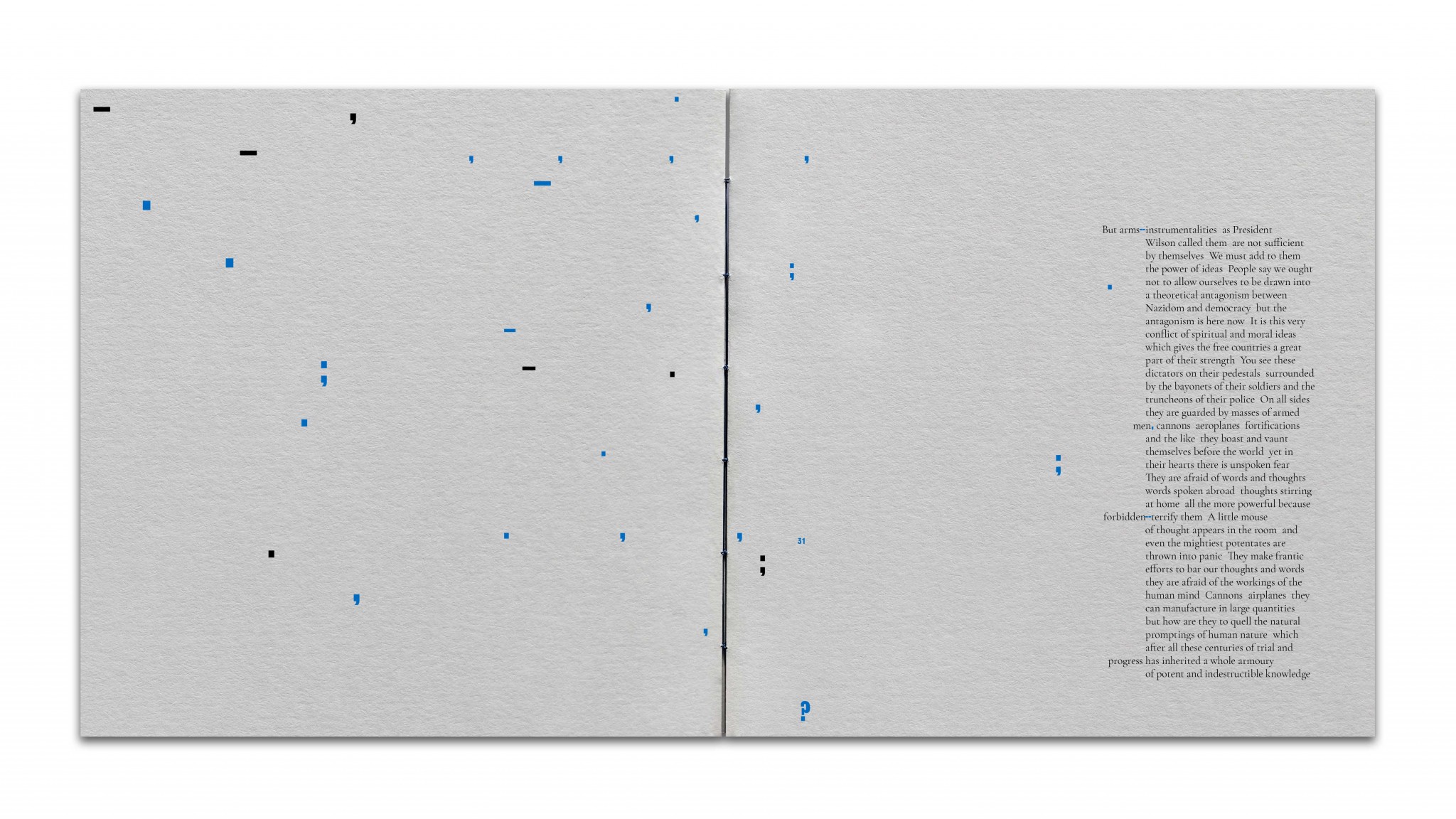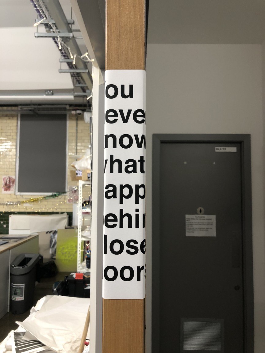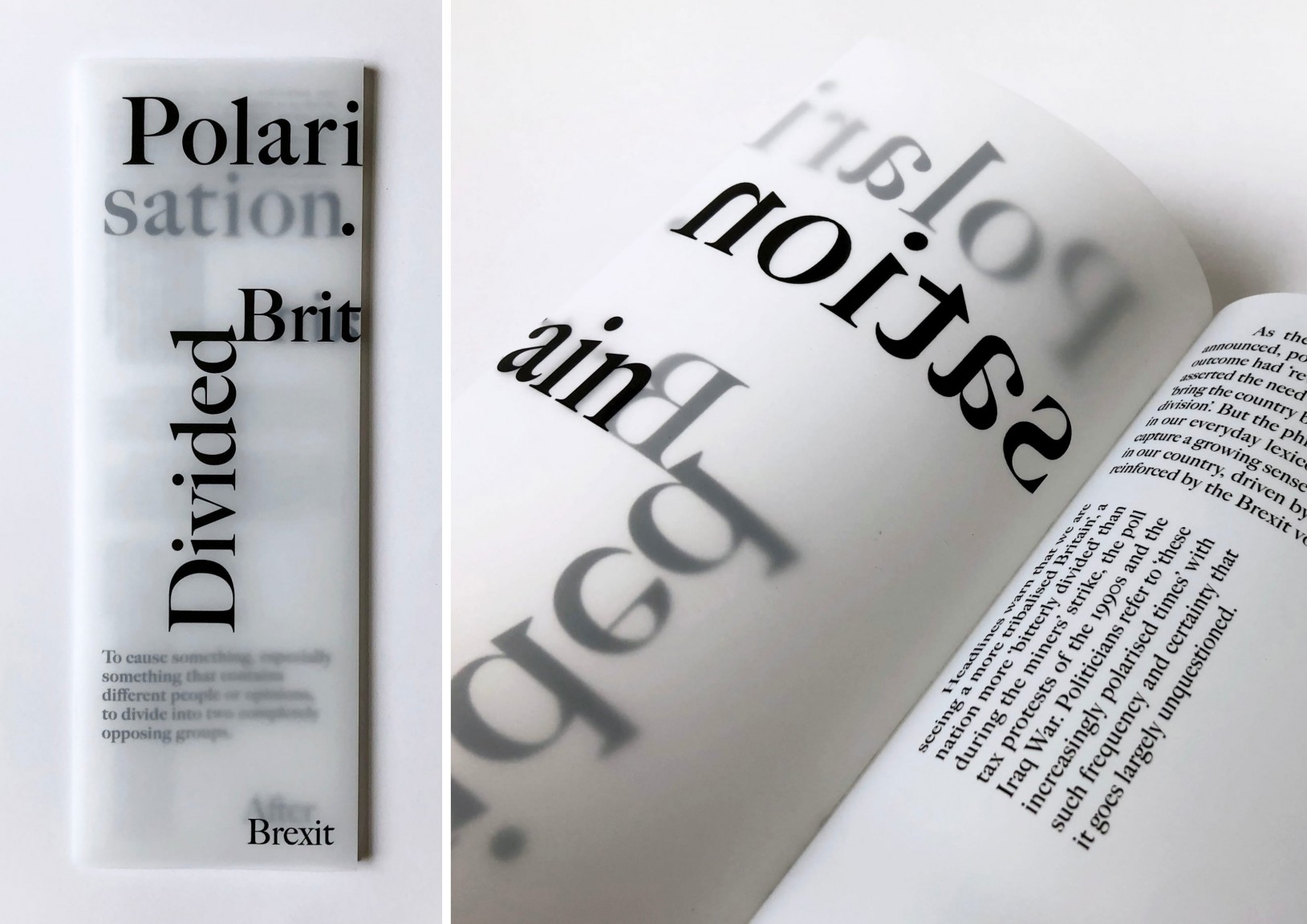 “I was interested in the idea of a polarised society as a political definition and the opposite of this being the scientific definition – the polarisation of light. This created lots of visual ideas of opposites, size, division, folds, repairing and more”.