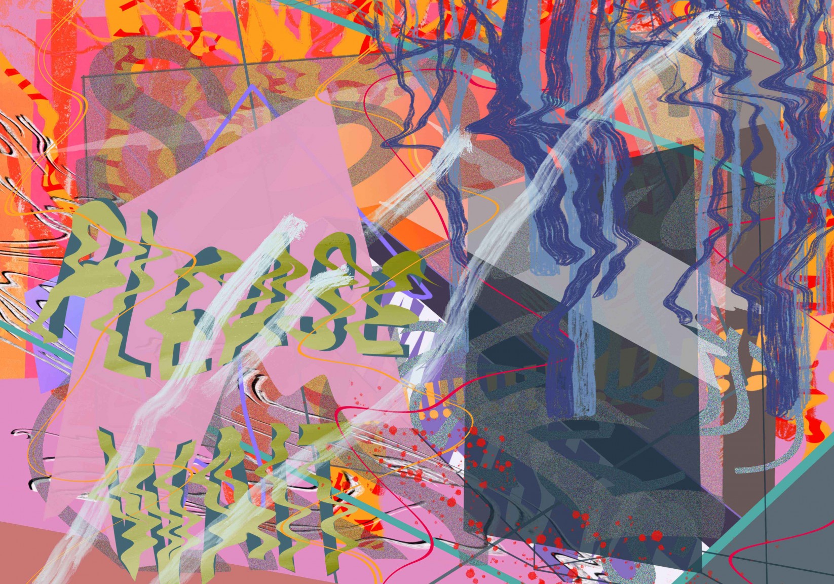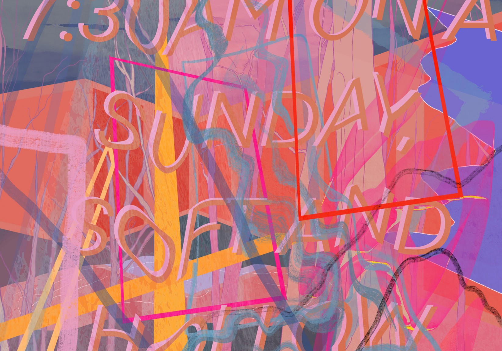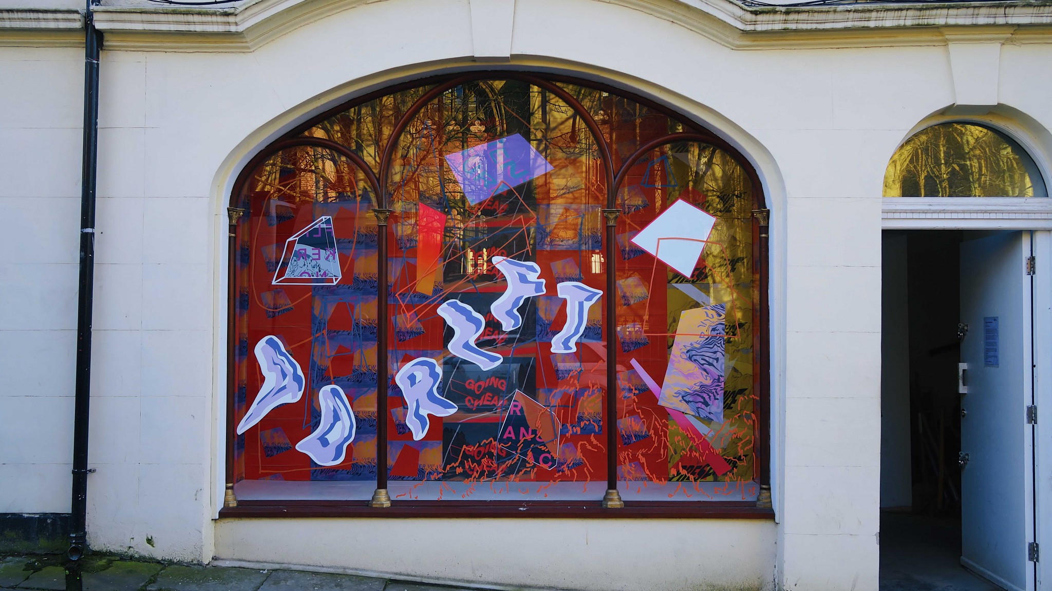 Hopkinson’s work draws from landscape, space, place, the history and romanticism of landscape painting, the graphic language of advertising and the city, the tension between text and image, the sensuality of word as image and the overlap between written and visual language. From the disparate reference points she simplifies and combines, a visual mash-up of information, some clear, some obscure. The kitschy residue of romantic landscape paintings folds into the language of advertising and modernity; as if the Sunday supplement is collapsing in on itself. Text forms, colour planes and ambiguous shapes overlap both each other and the landscape behind, at once harmonious with the natural space and constantly interrupting it.