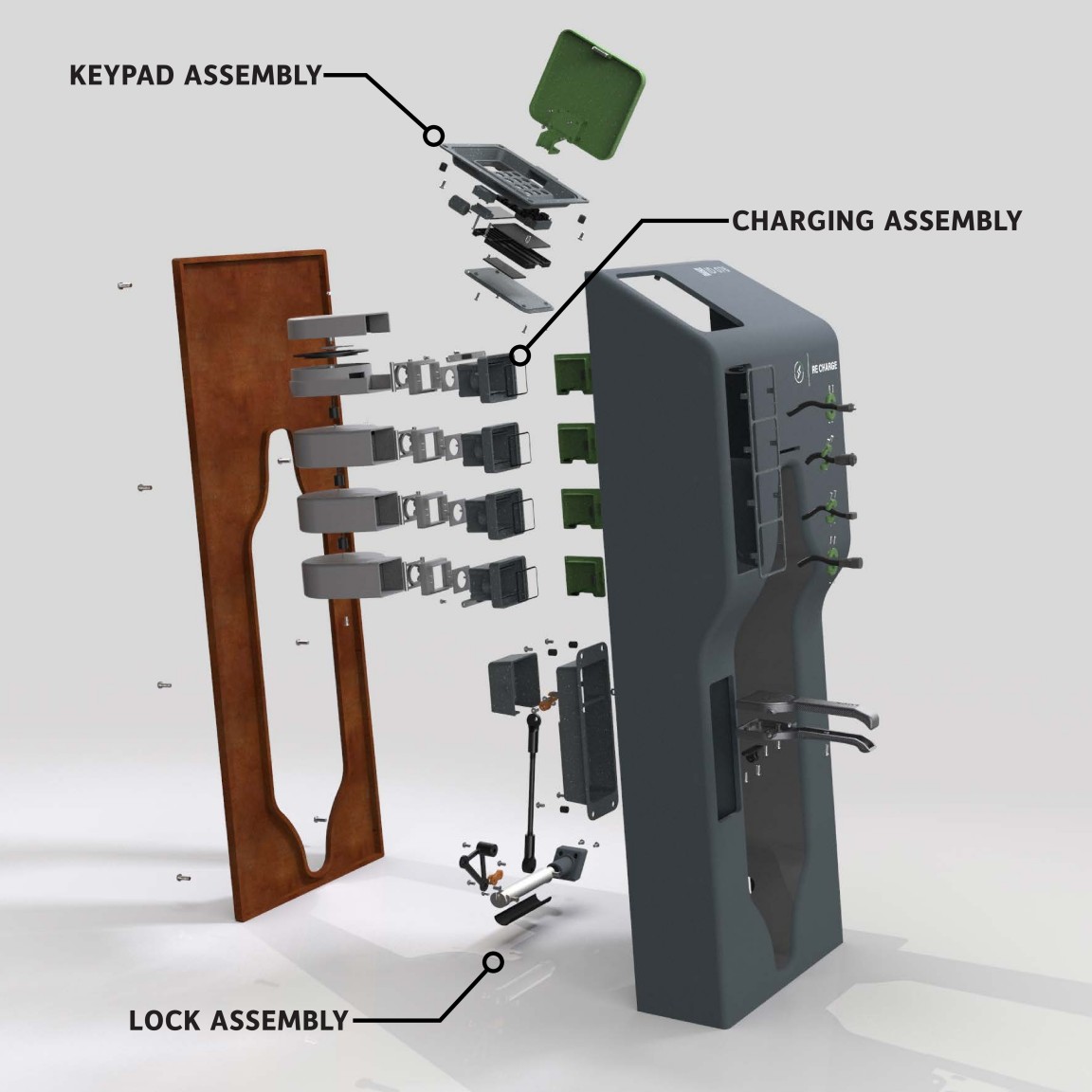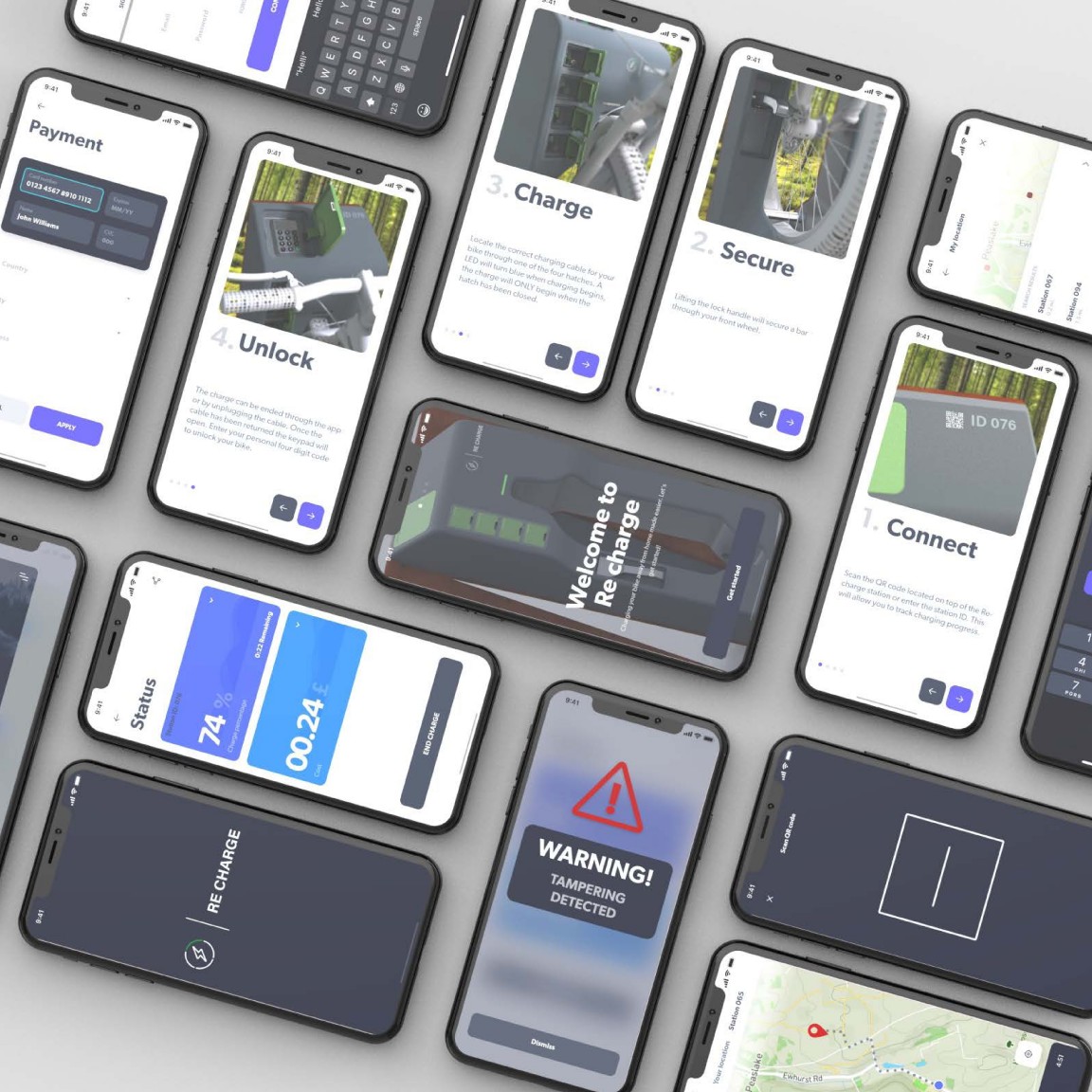 Electric bikes (E-bikes) are gaining popularity but there is a lack of infrastructure to support them. With people more likely to be using electric vehicles in the future E-bike charging stations are needed to help accelerate their use. As people move towards greener modes of personal transport, cars dominance is being challenged. RE-Charge’s inbuilt security features give users peace of mind that their bike will be safe from theft. The supporting app offers a mapping service to locate stations, real time charge status and a theft warning feature. RE-Charge is designed to be used at popular mountain biking locations across the country, with the potential to be adapted for city use as well to eliminate range anxiety for all electric bike users.