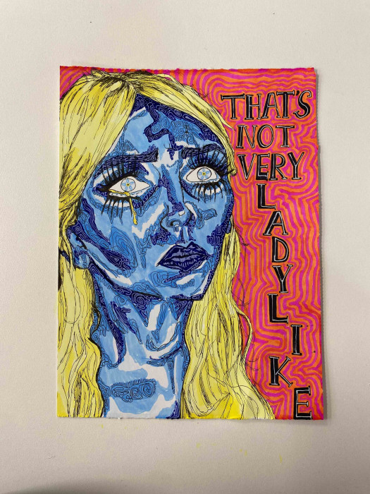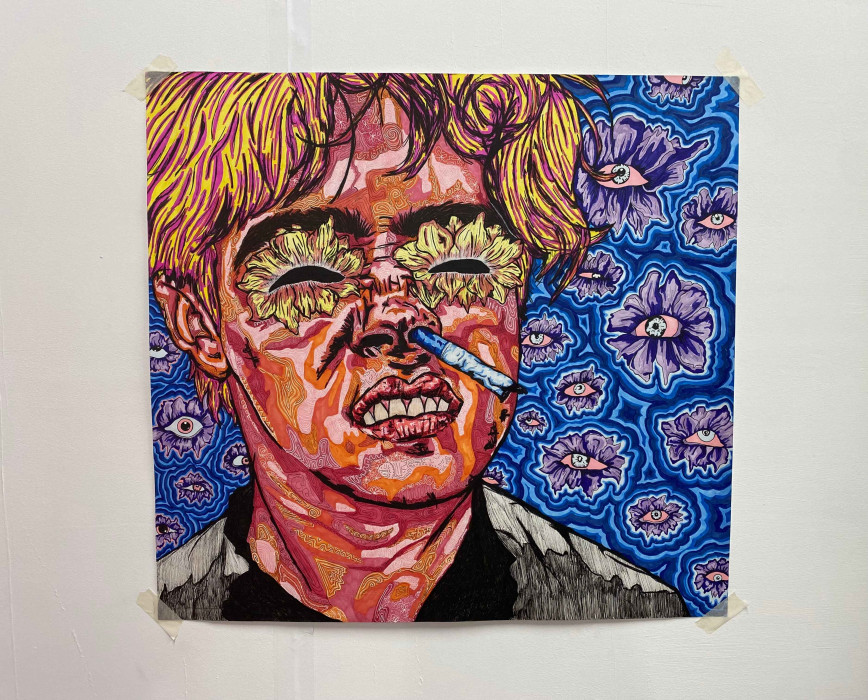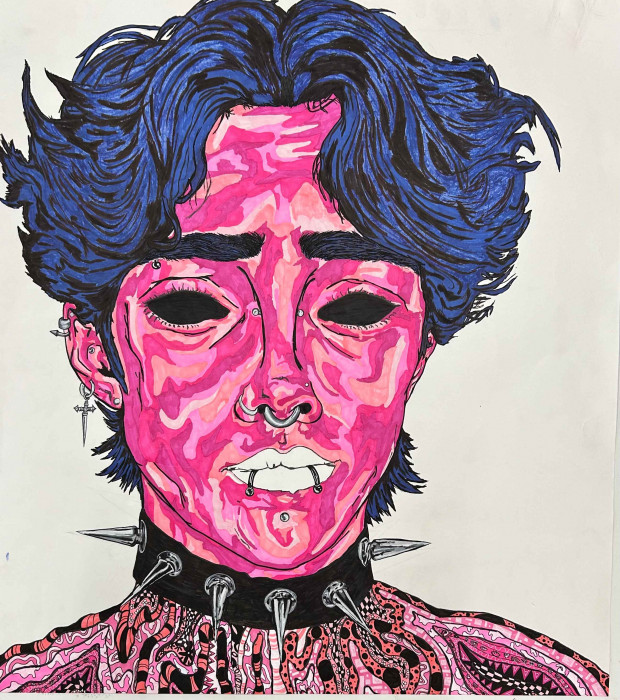 Clo Evans in her project Realeyes delves into art as her escapism from her thoughts. It serves as a means to express and work through emotions she keeps hidden from others in her personal life, exposing them through symbolism and portraying others in her portraits. This year’s focus has been on identity, exploring the dissonance between how individuals present themselves and how they are perceived by others, juxtaposed with the inner battles they face and the masks they wear to conform.