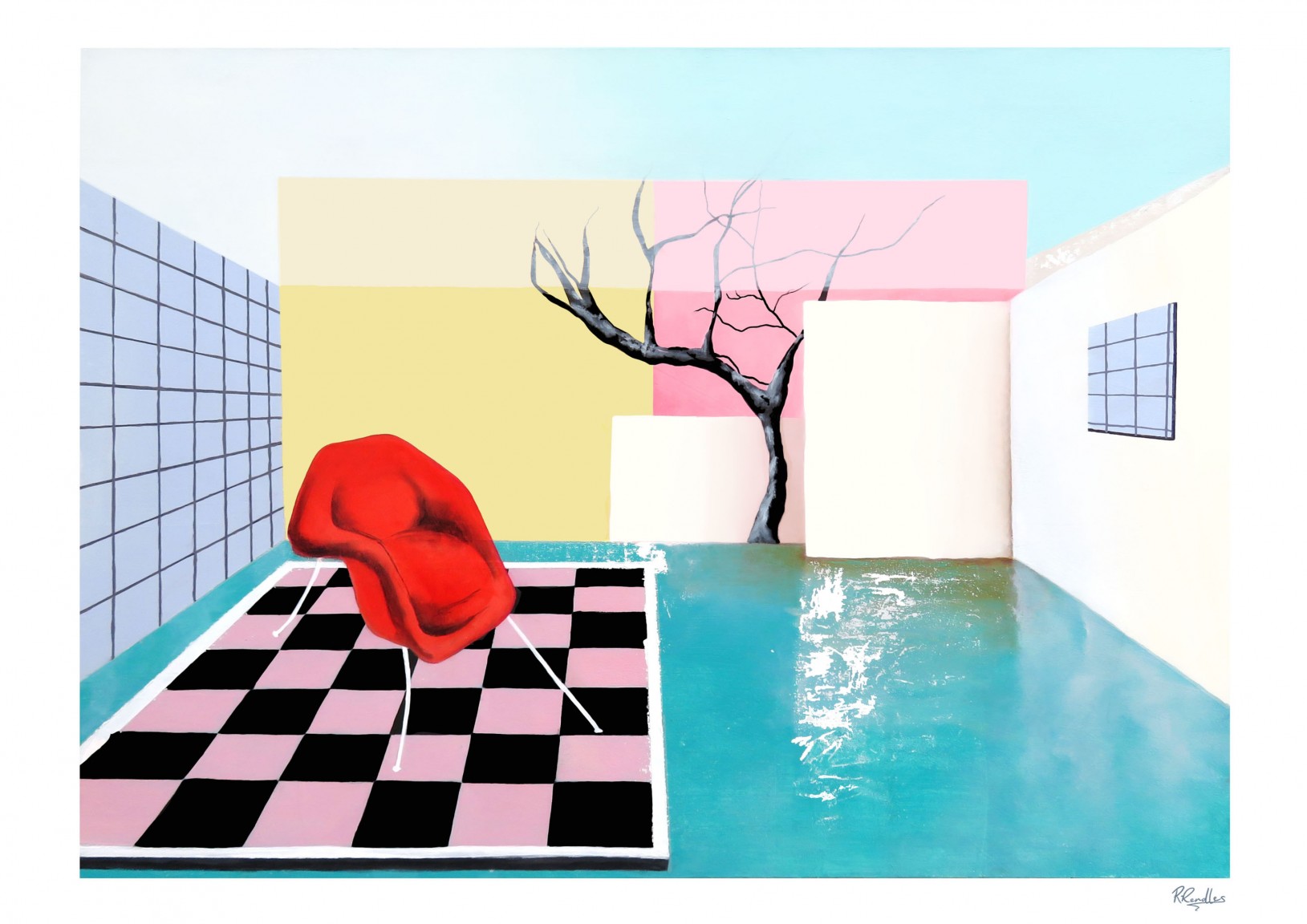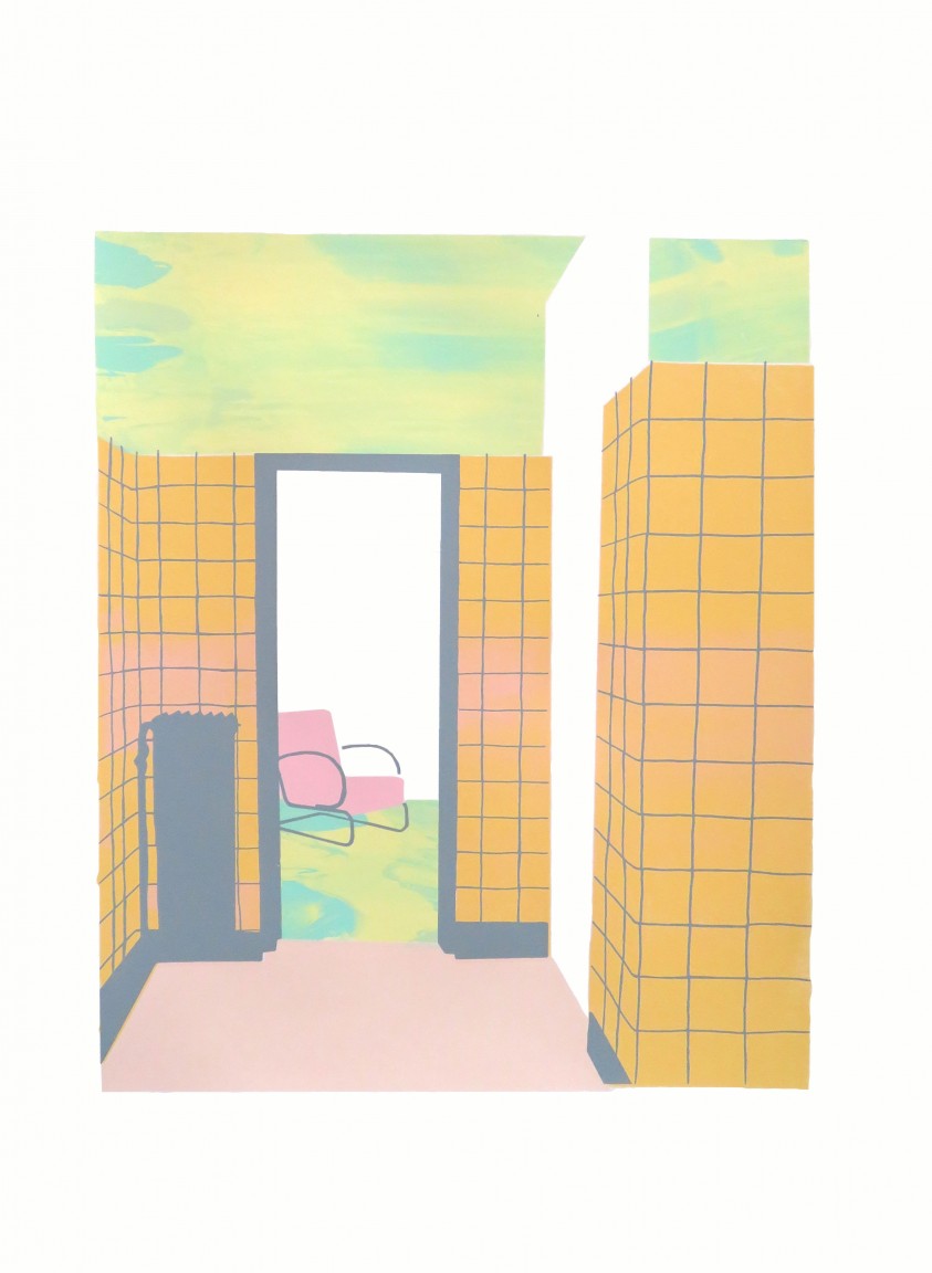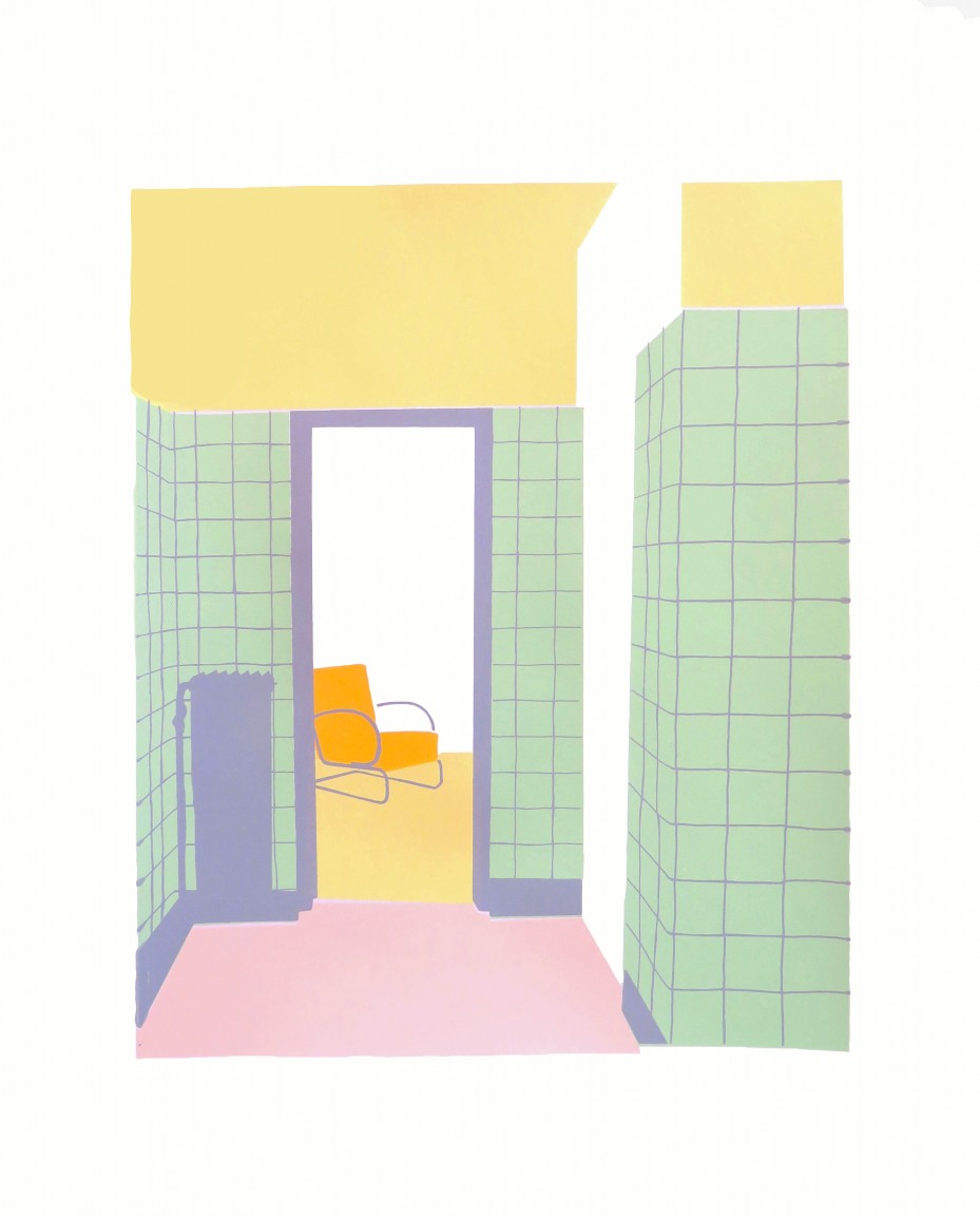 Drawing on mid-Twentieth Century design and visual art, Rosie Rendles’ paintings explore otherwise ordinary interior spaces, rendering them as dreamlike narratives, where the representation of both time and space is questioned, and the boundaries between the real and conjectured blurred.