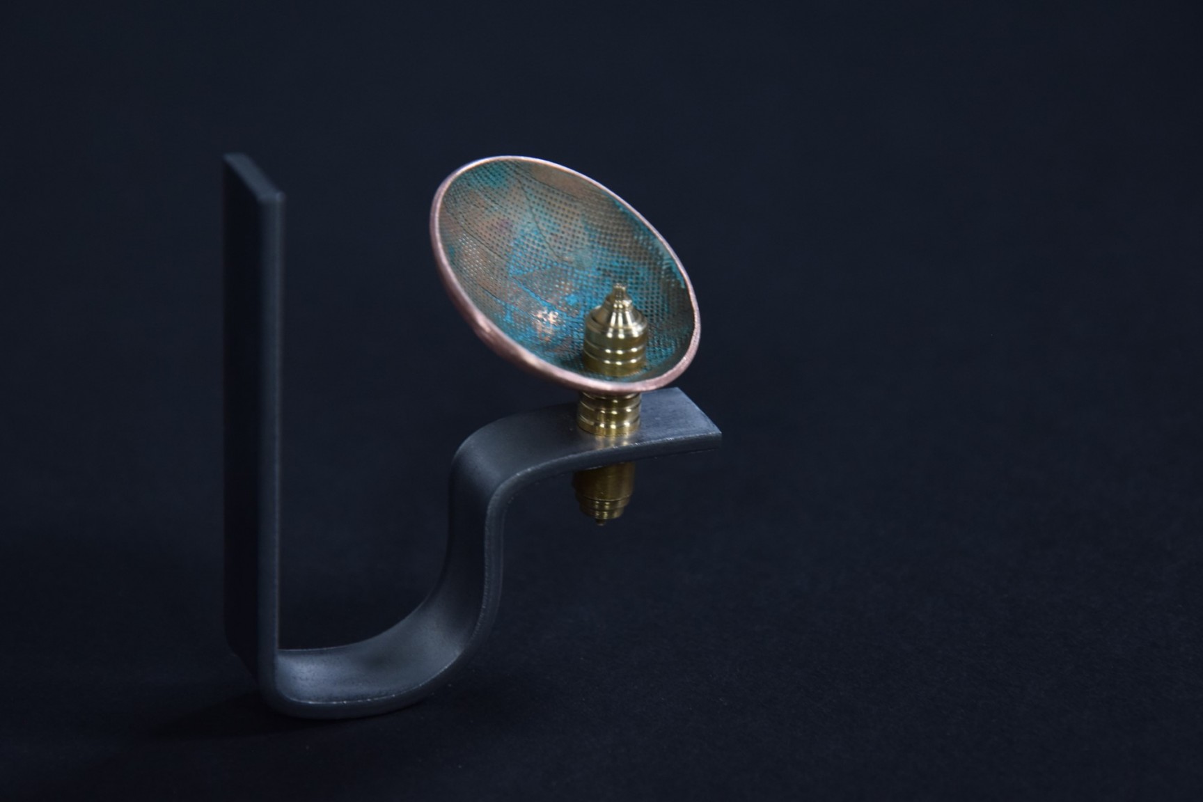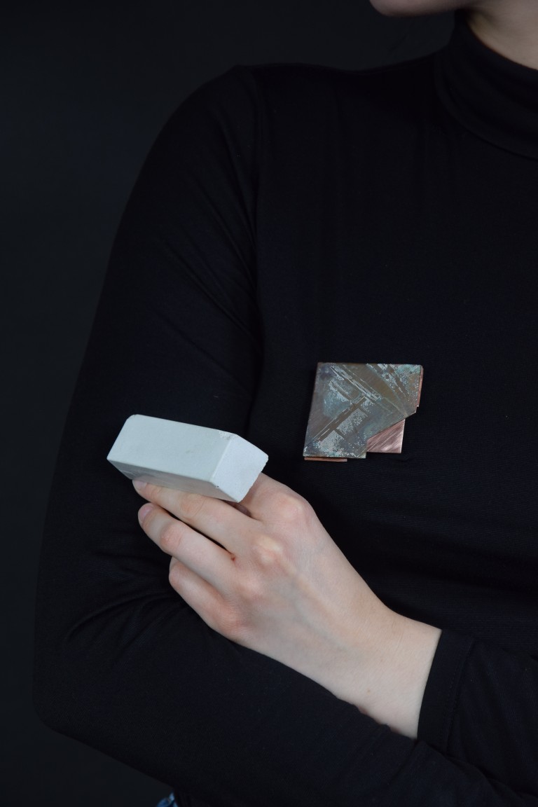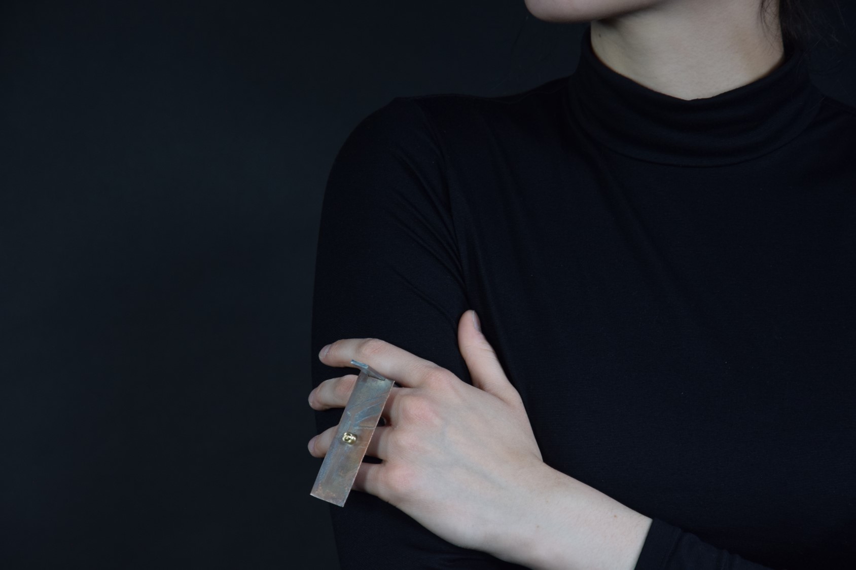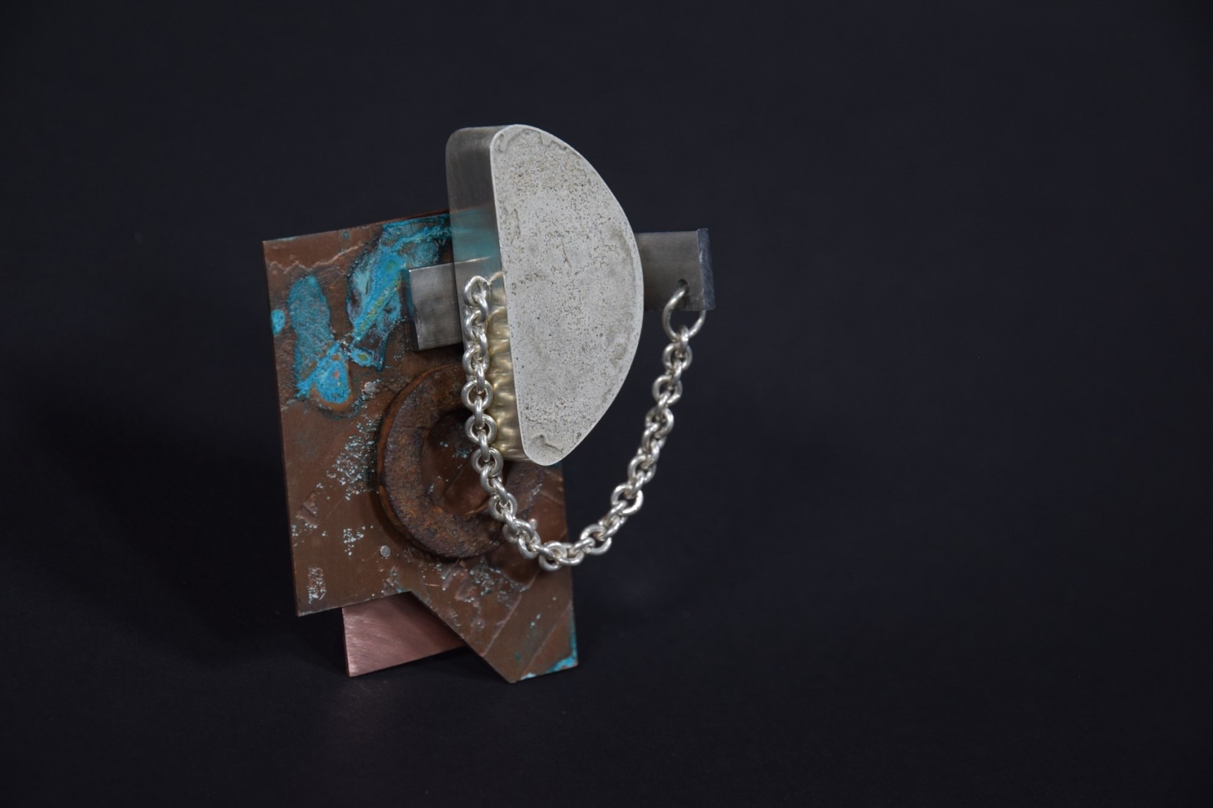 Questioning what ‘value’ is within the jewellery world through her material choice, Spellacy experiments with found objects, industrial materials, and waste to communicate the narrative being portrayed through her work. Her approach to design holds a strong emphasis on graphic structures that reflect the paintings inspired by Constructivist art produced within her research. This location-based narrative is enhanced by the use of photo etching techniques, keeping the presence of these environments at the forefront of her designs. The imagery is complemented by textures of old metals and subtle patina finishes, contrasting with various brushed polishes. This subconscious acceptability towards old materials has opened a forward-thinking attitude to reusability and use of waste materials within her jewellery design.
